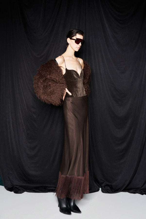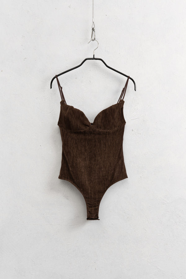 Body de terciopelo. Tirantes finos y pinzas en el busto. Cremallera lateral oculta. Cierre de clip en el bajo. Corte regular, disponible en tallas S/M/L.