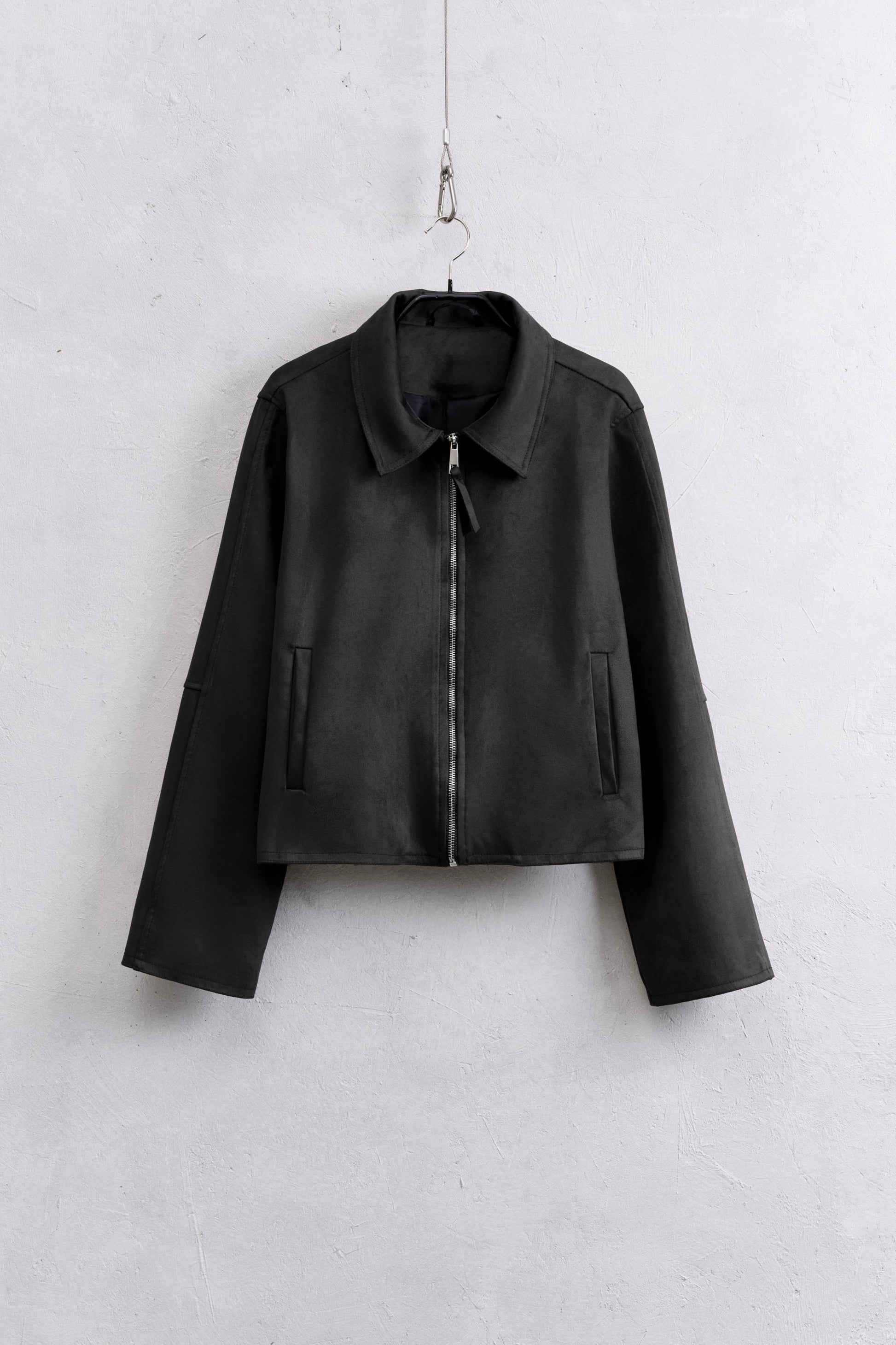 Chaqueta de ante sintético. Cuello con solapa. Cierre frontal con cremallera. Bolsillos delanteros y forro interior. Corte regular, disponible en tallas S/M/L