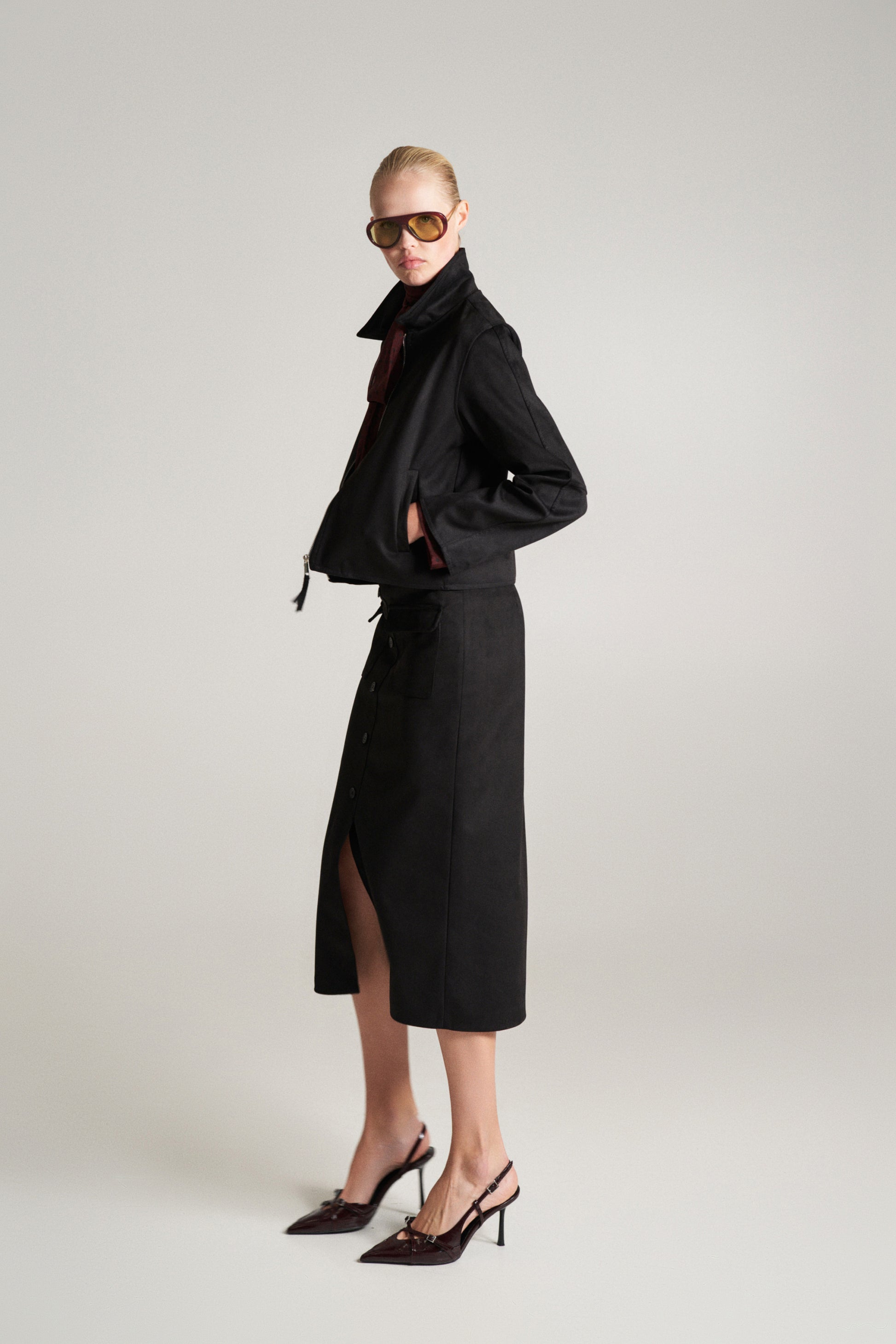 Falda midi de antelina. Bolsillos y botones delanteros. Abertura central delantera. Cierre de cremallera en la espalda. Trabillas para cinturón. Corte regular, disponible en tallas S/M/L.