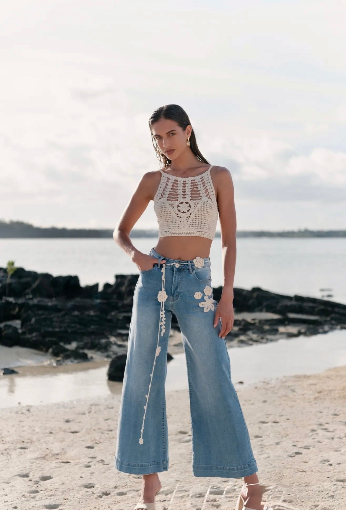 Jeans de tiro alto y cinco bolsillos. Pierna ancha extra larga. Cierre con cremallera y botón metálico.