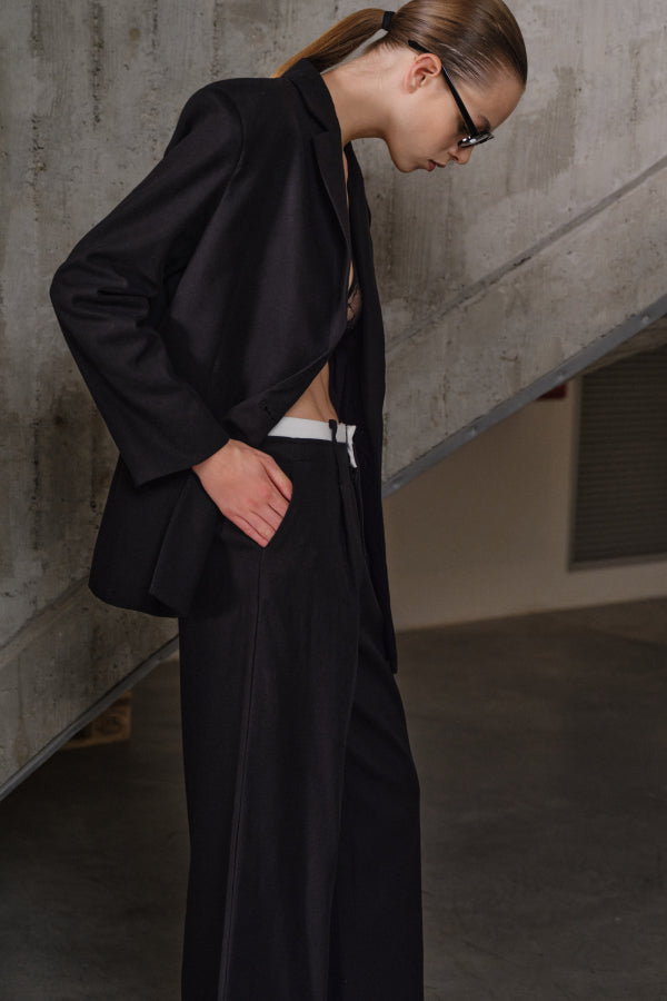 Pantalón largo palazzo. Cinturilla en contraste. Bolsillos delanteros y trabillas. Bolsillos de ribete en la espalda. Corte regular, disponible en tallas S/M/L.