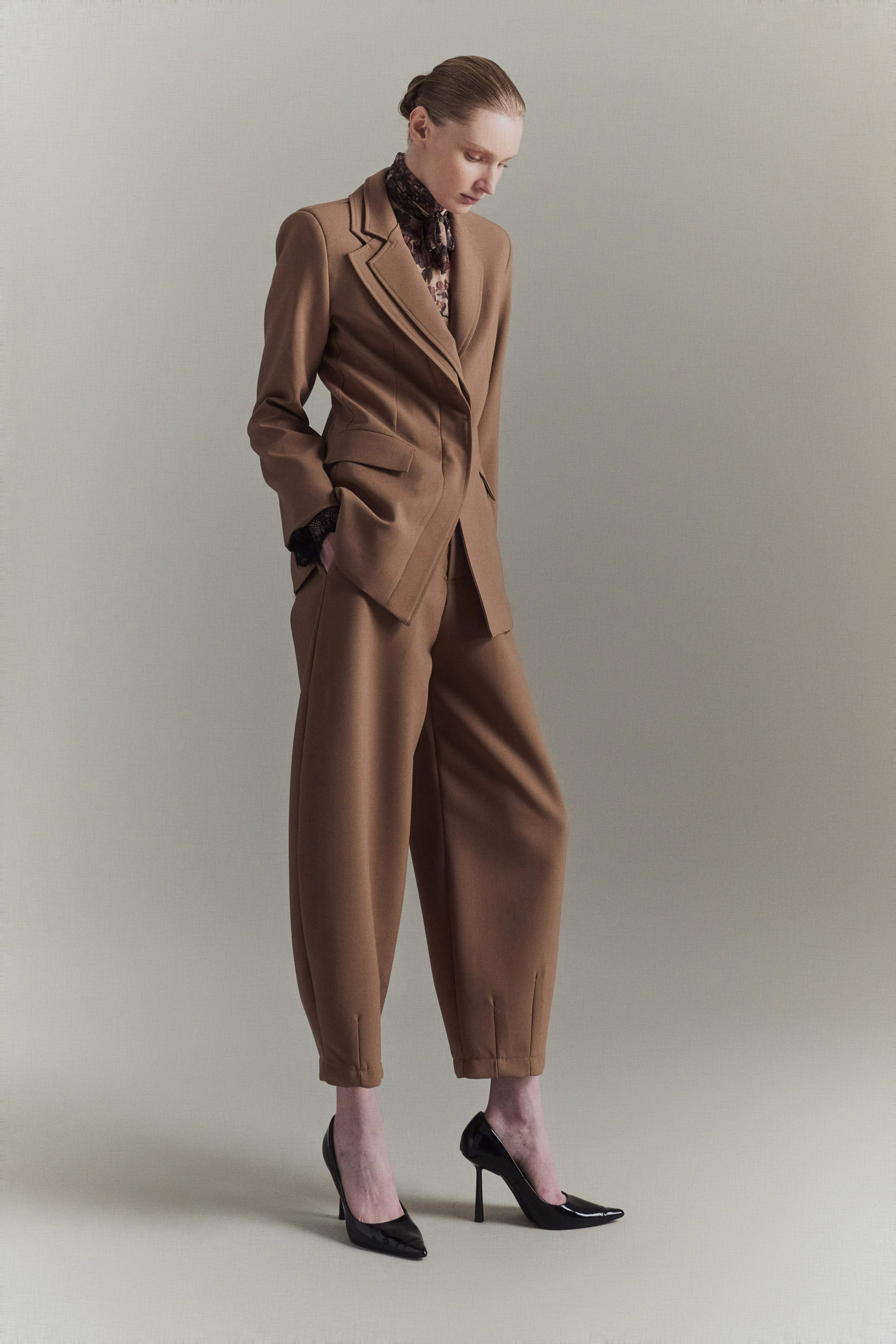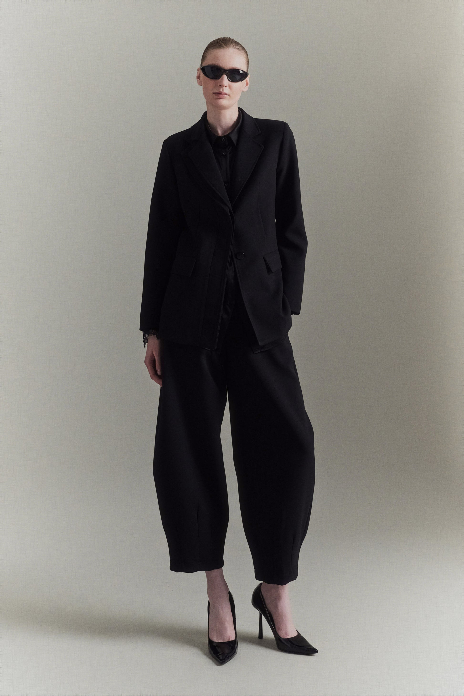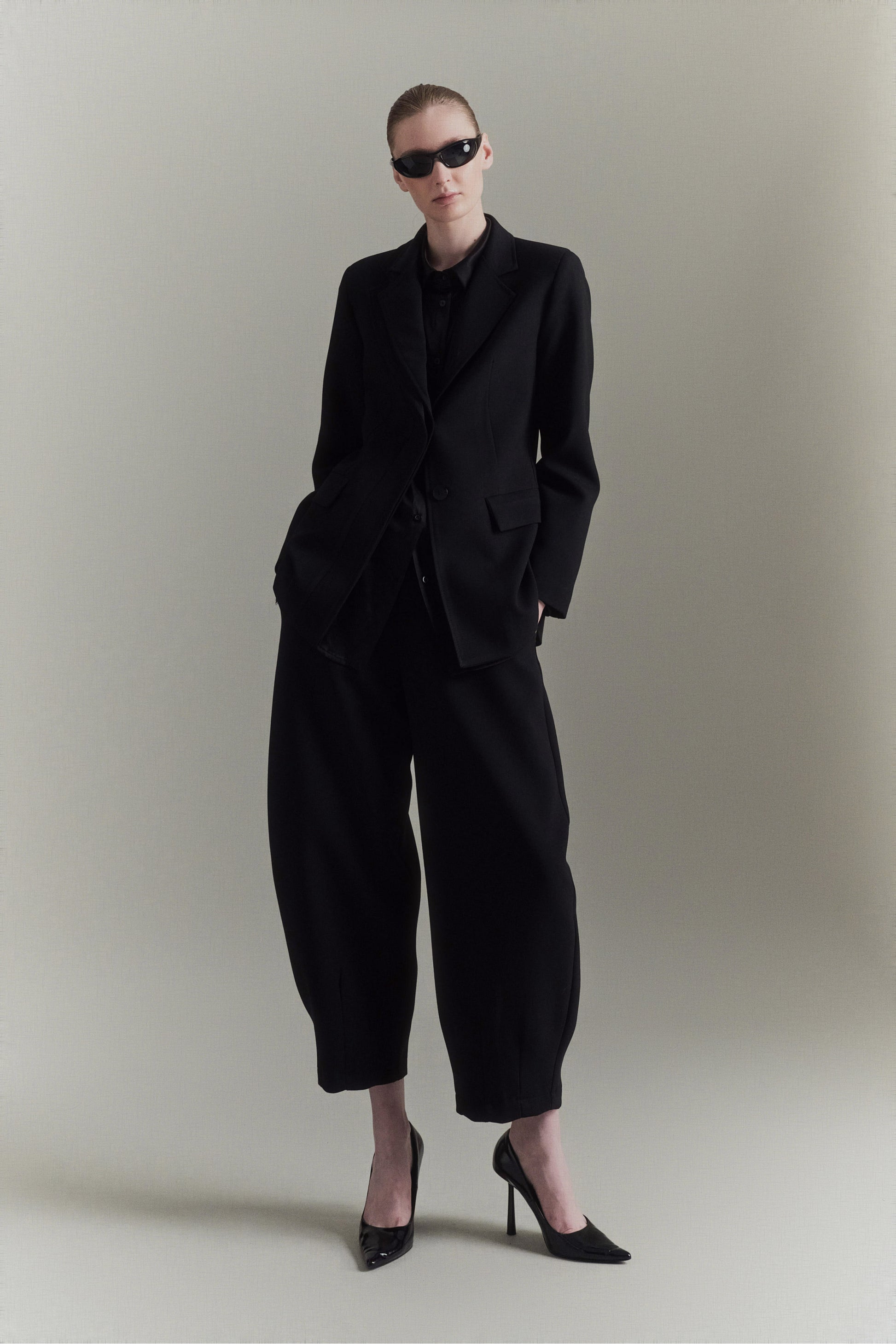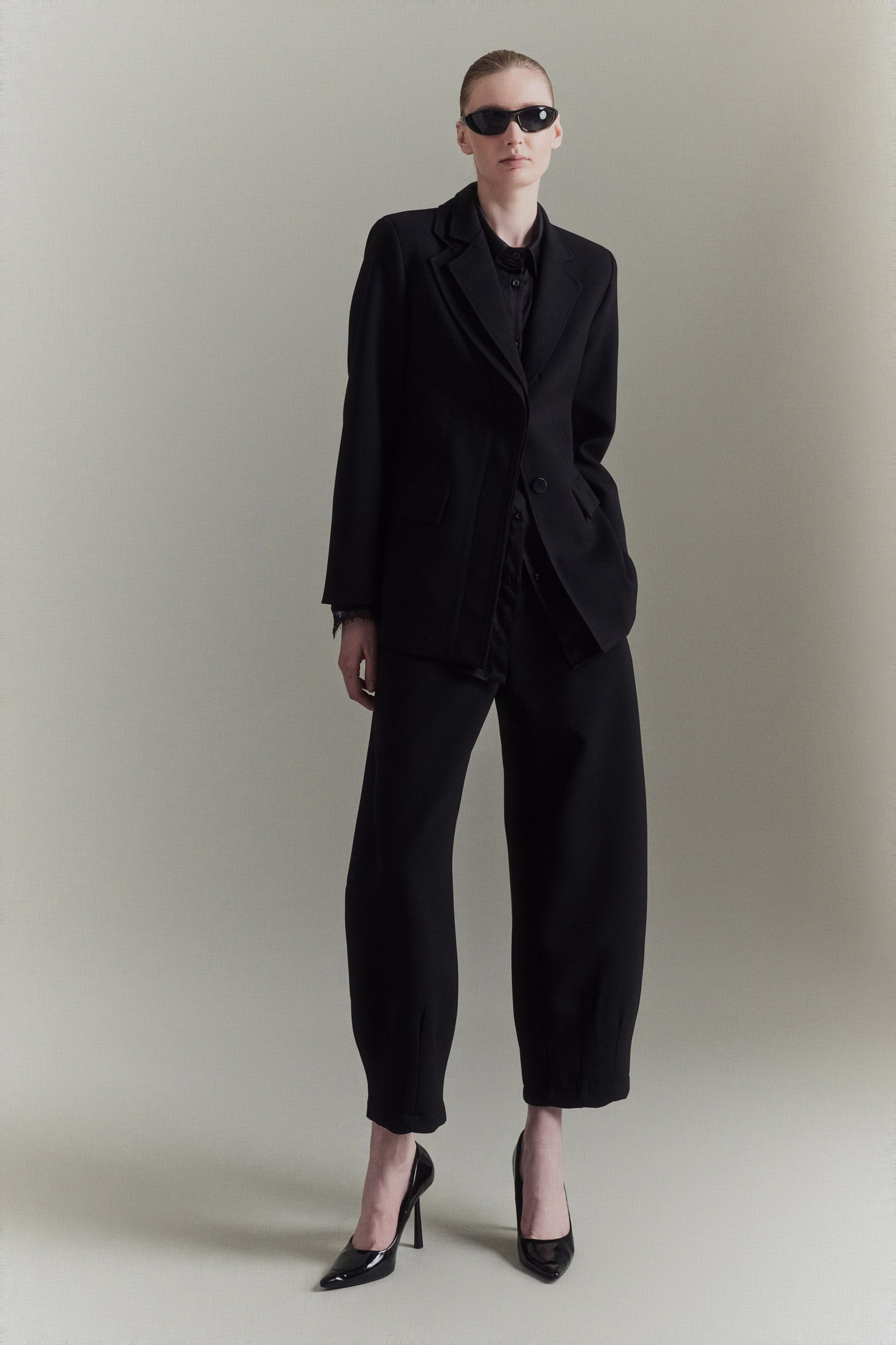 Pantalón globo de mezcla de viscosa. Detalle de pinzas en el bajo. Cierre con cremallera y gancho oculto. Corte regular, disponible en tallas S/M/L