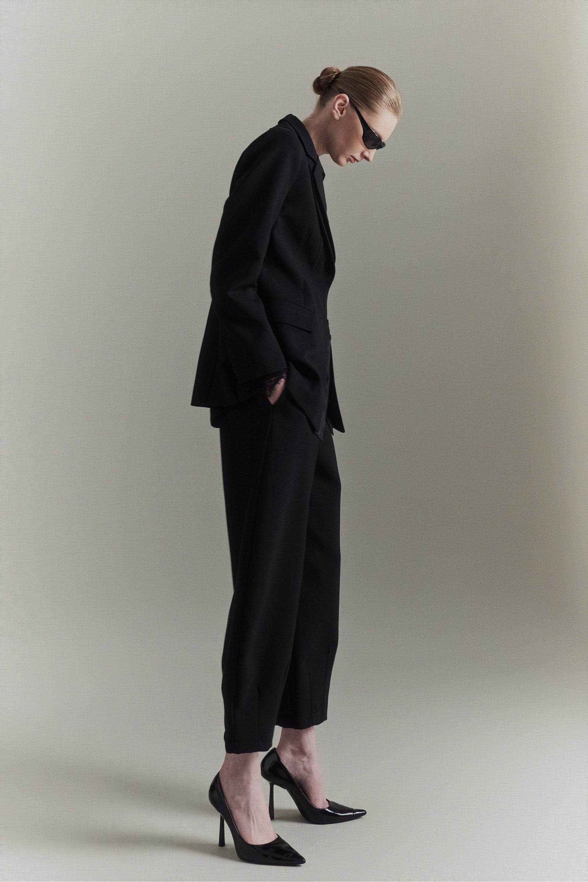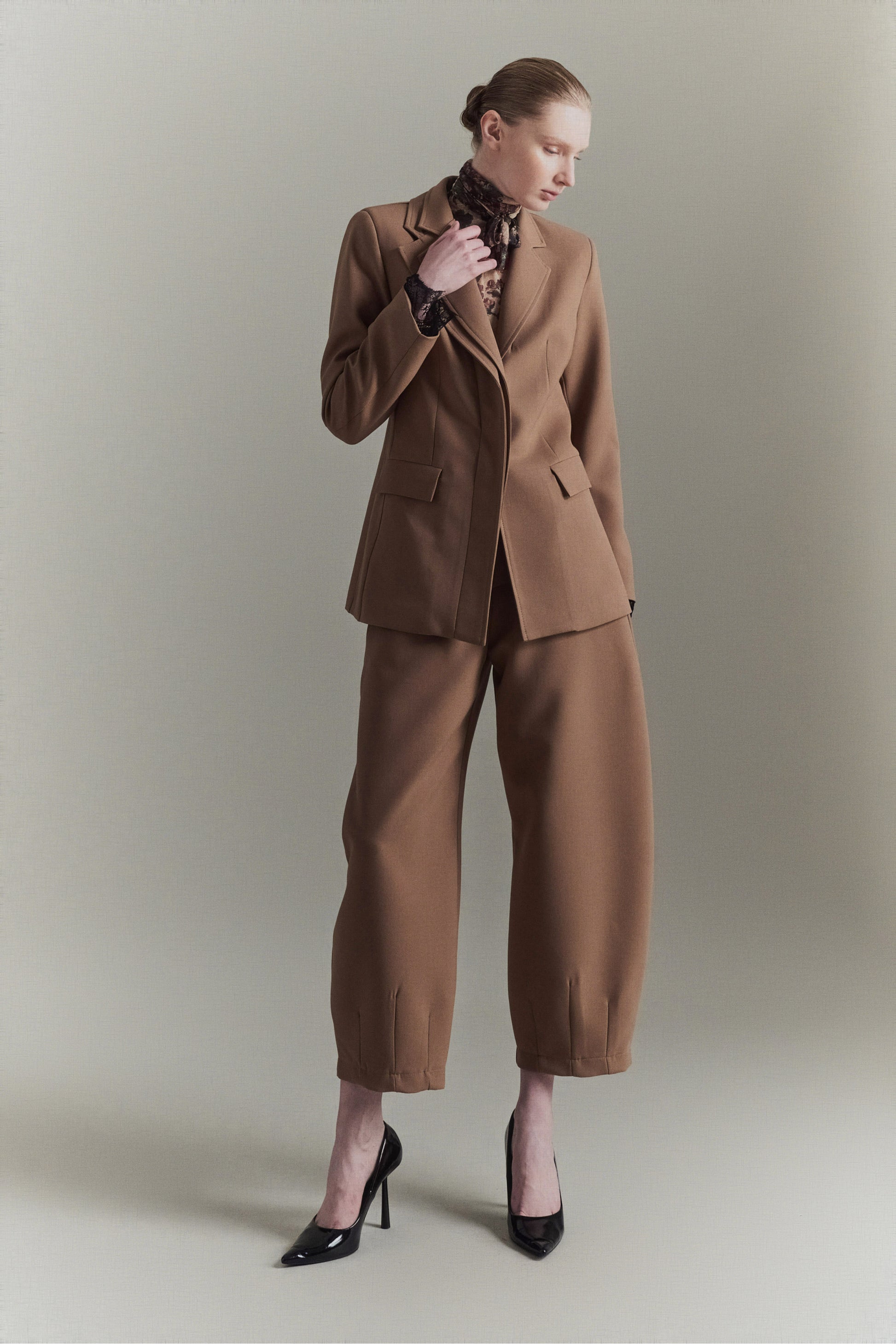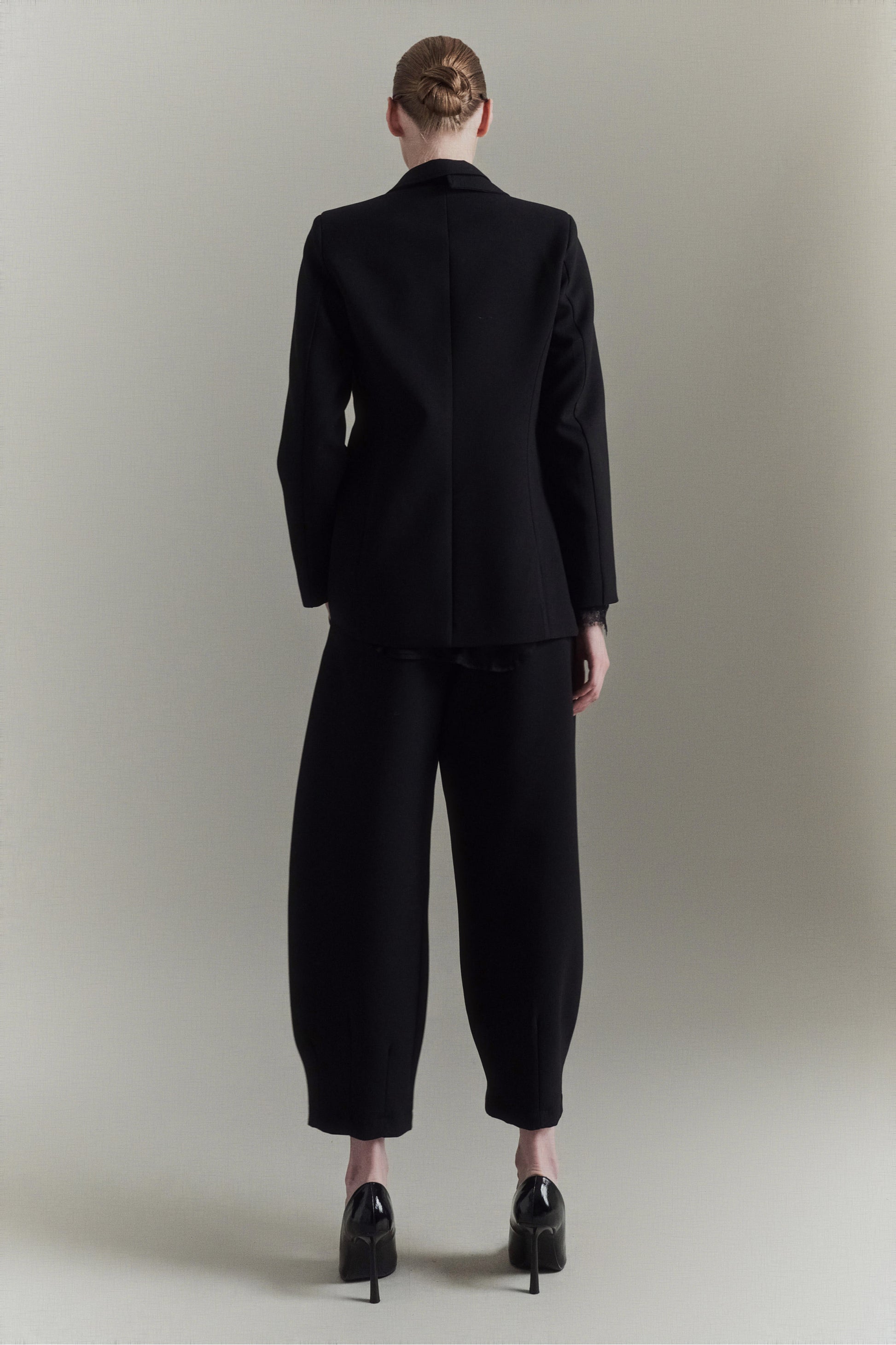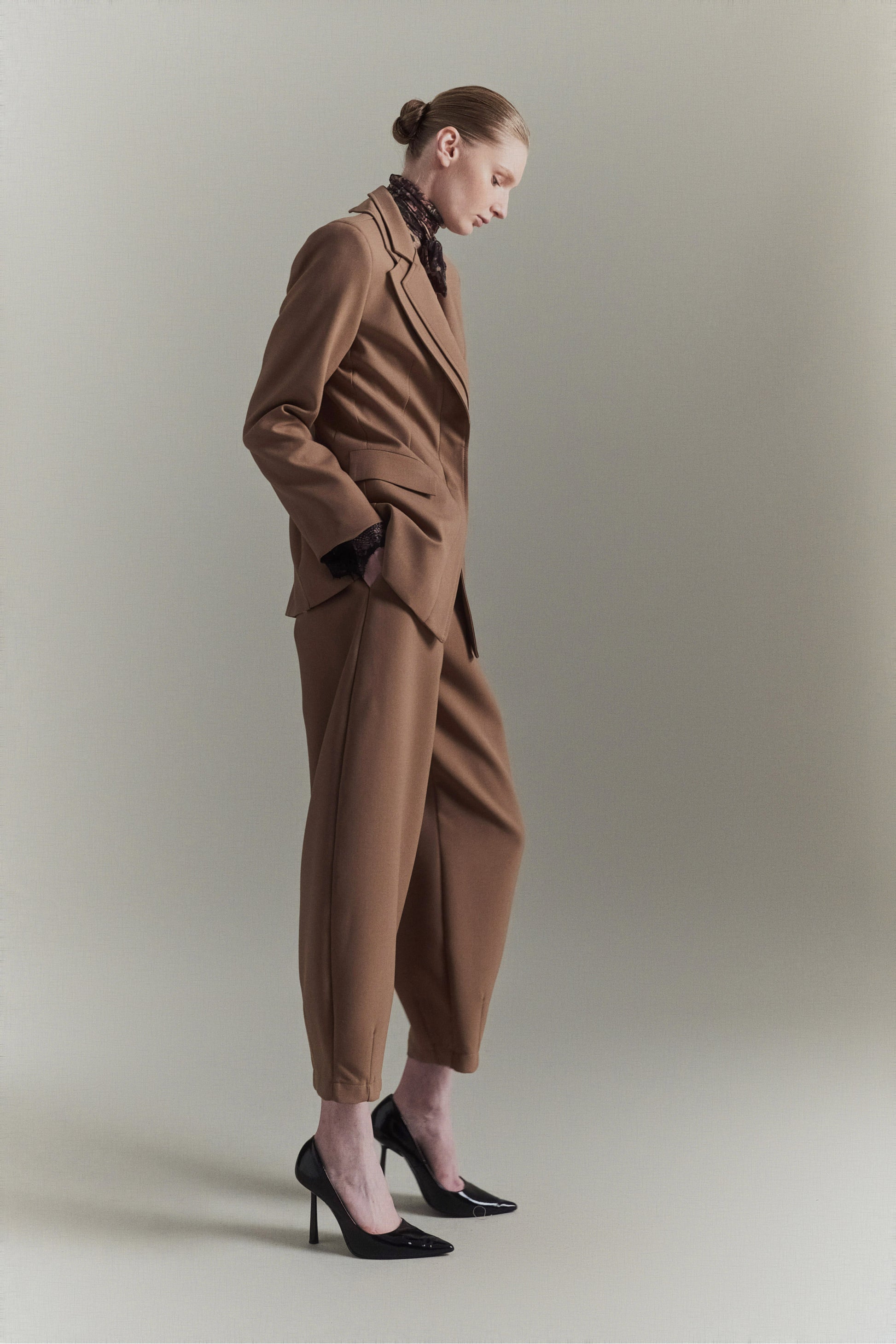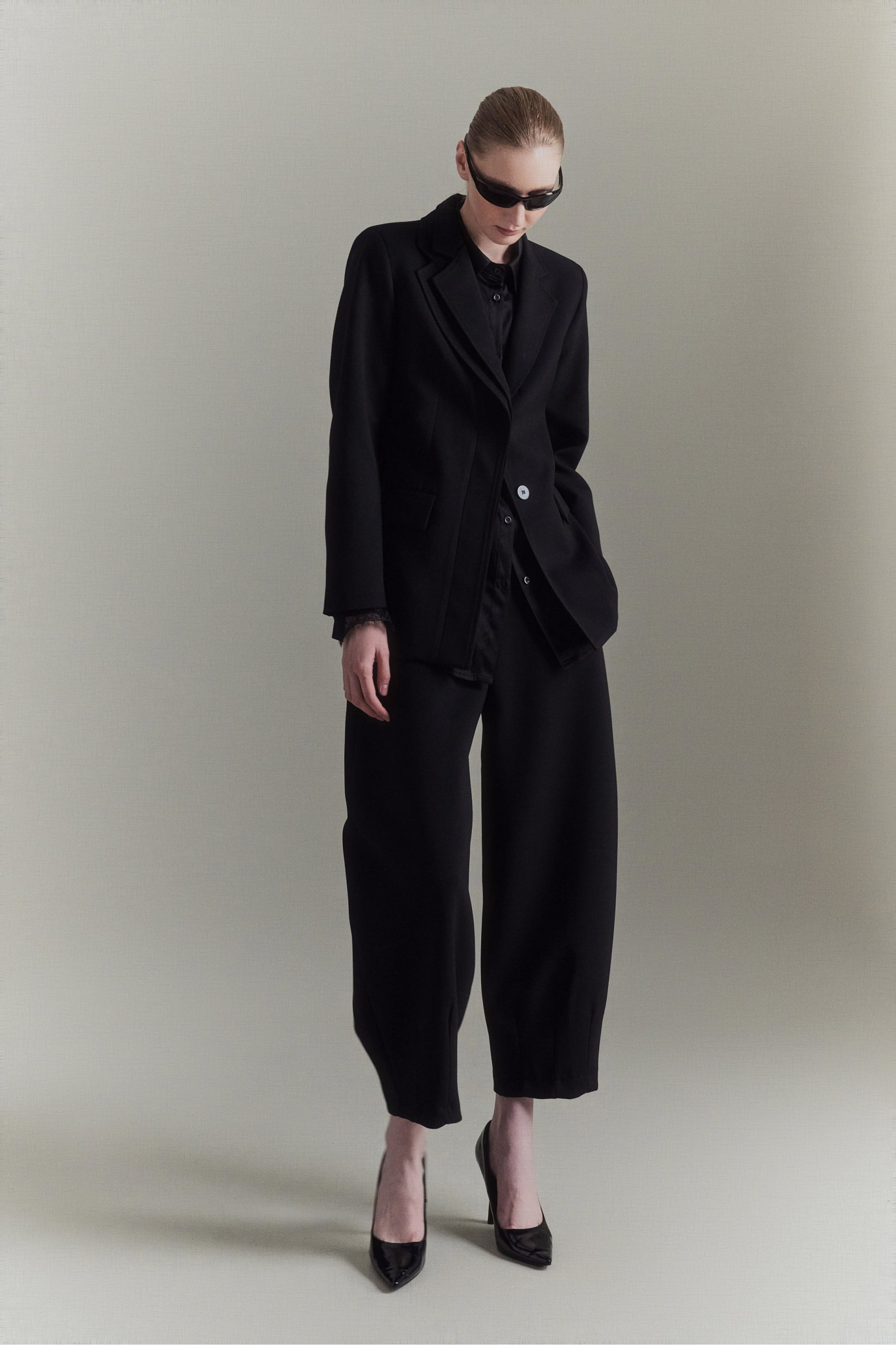 Pantalón globo de mezcla de viscosa. Detalle de pinzas en el bajo. Cierre con cremallera y gancho oculto. Corte regular, disponible en tallas S/M/L