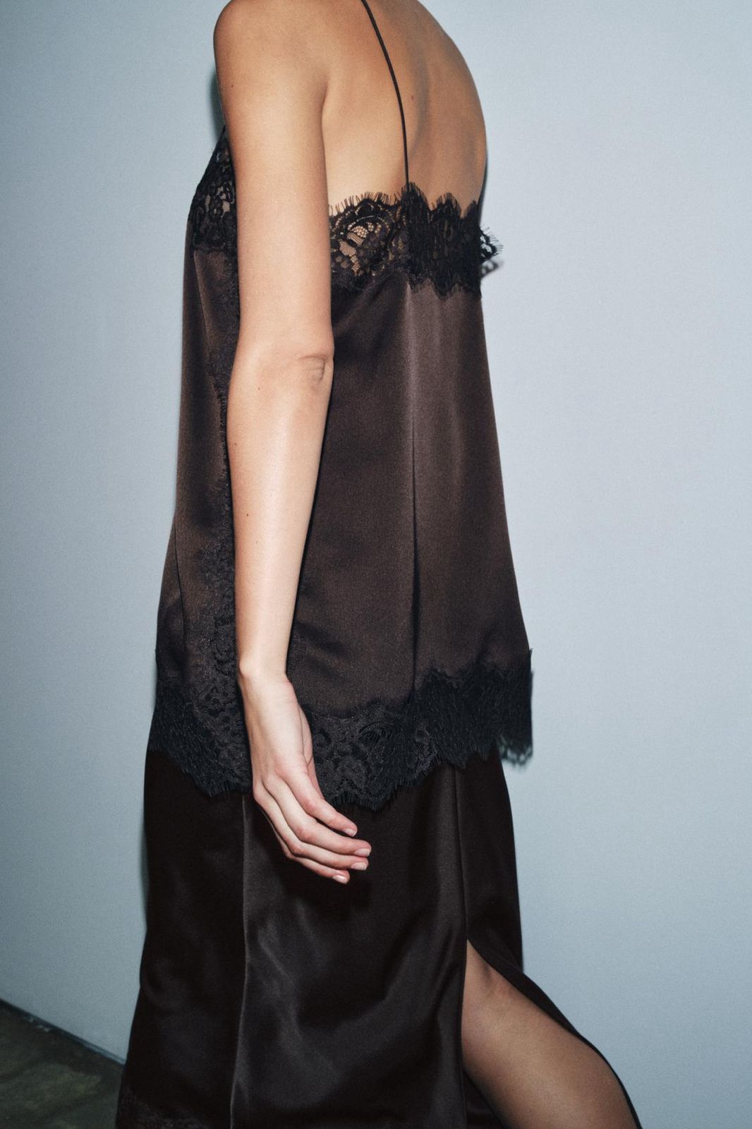 Top lencero de escote pico y tirantes finos. Detalle de aplicación de encaje a tono. Bajo asimétrico.