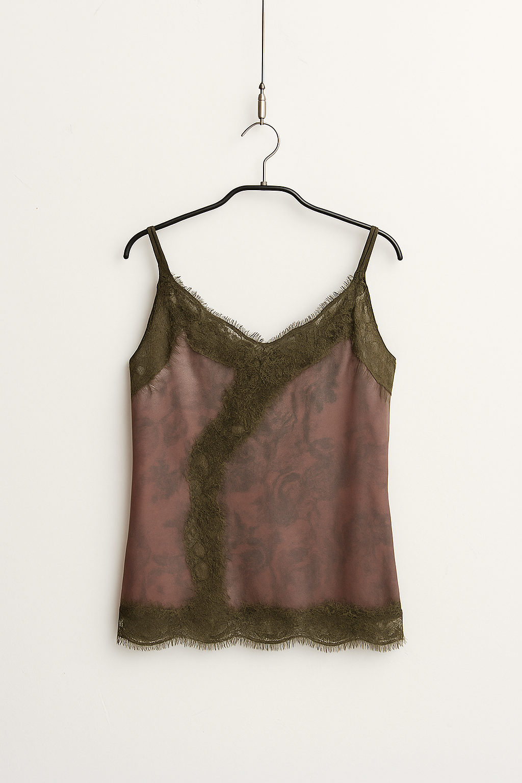Top lencero de escote pico y tirantes finos. Detalle de aplicación de encaje a tono. Bajo recto.