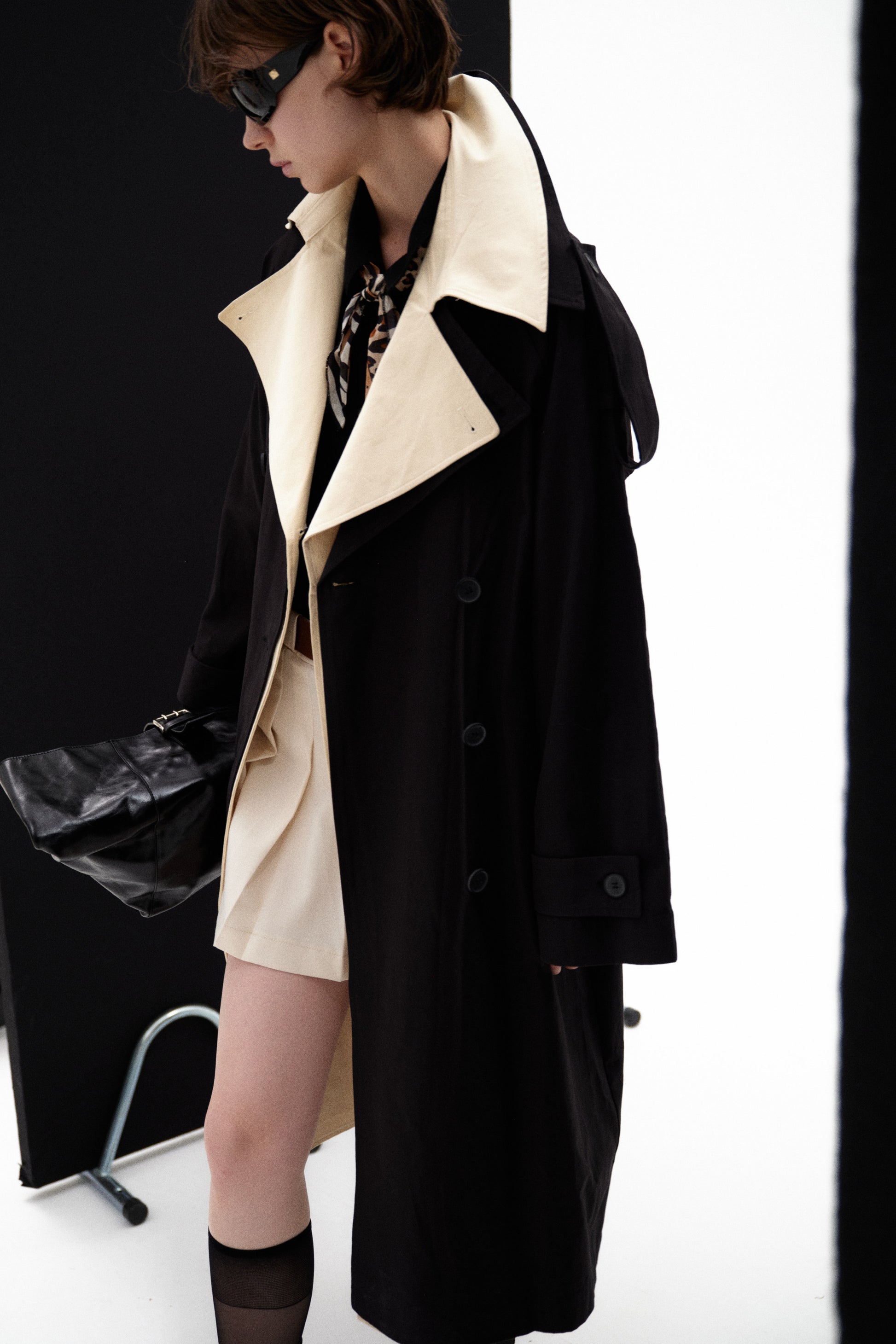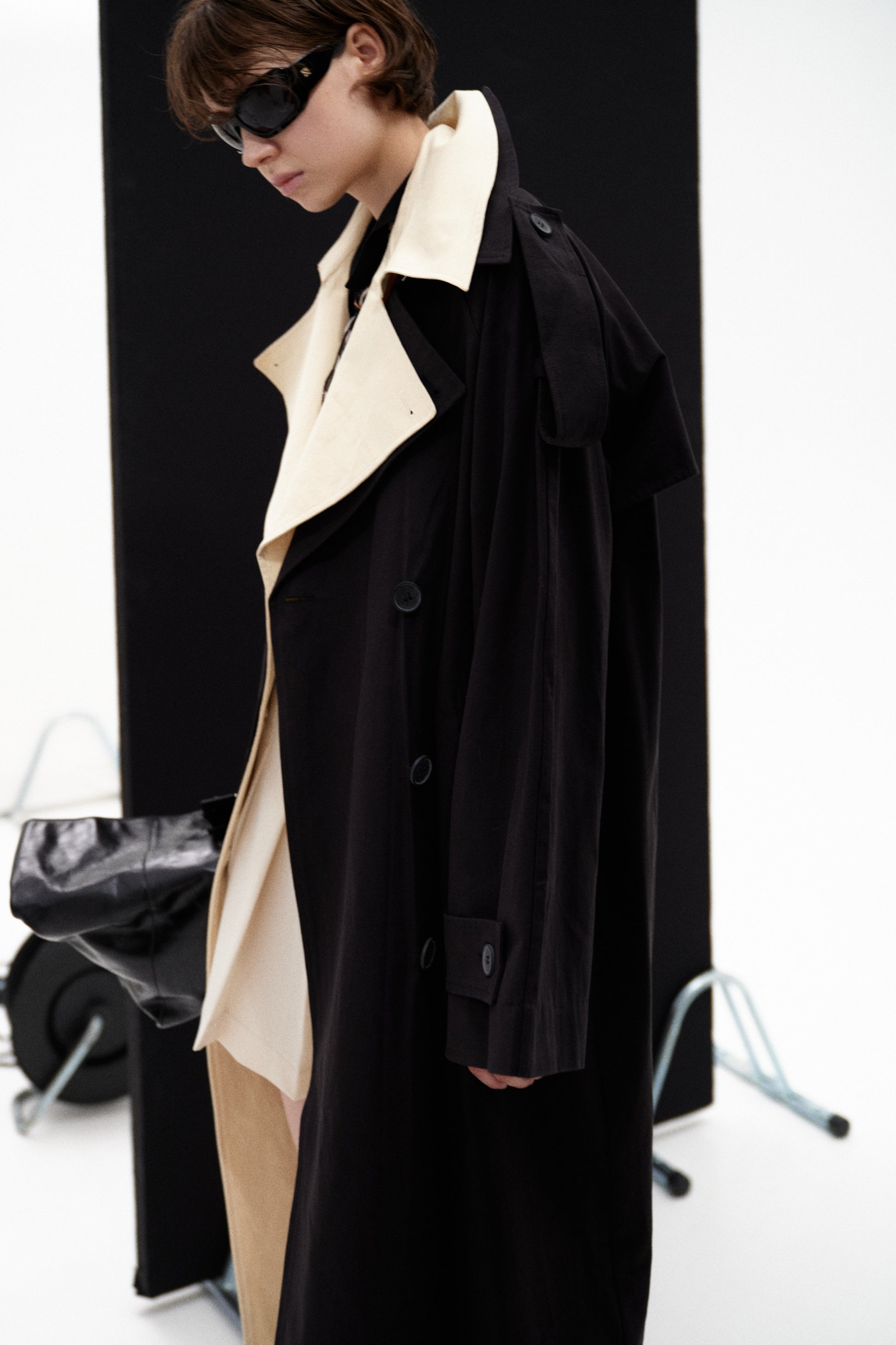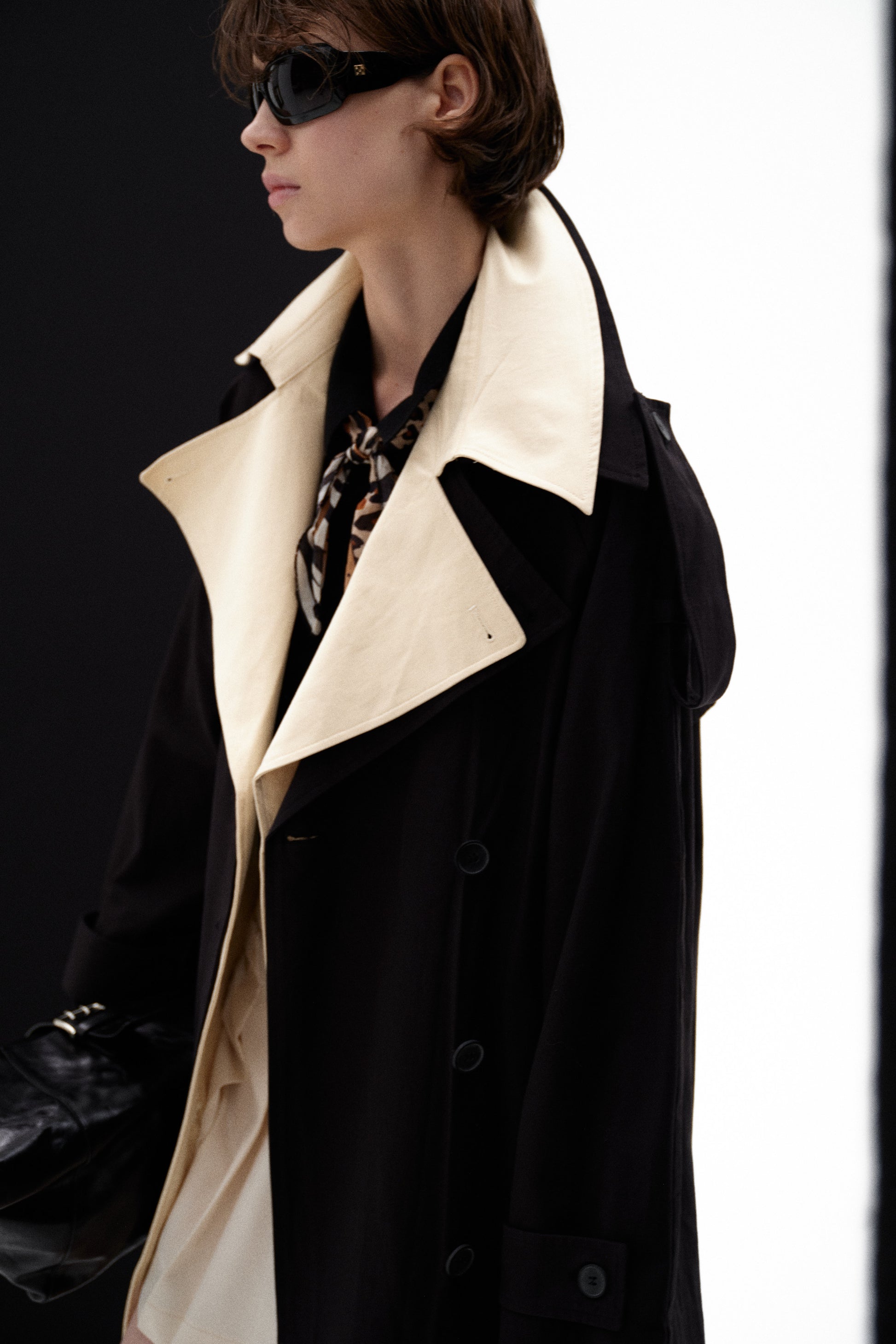 Gabardina larga con cuello de solapa. Cierre frontal cruzado con botones. Detalle de doble tejido en contraste. Tirantes en hombros y mangas. Cinturón ajustable. Bolsillos laterales delanteros. Abertura en la espalda. Corte regular, disponible en tallas S/M y M/L.