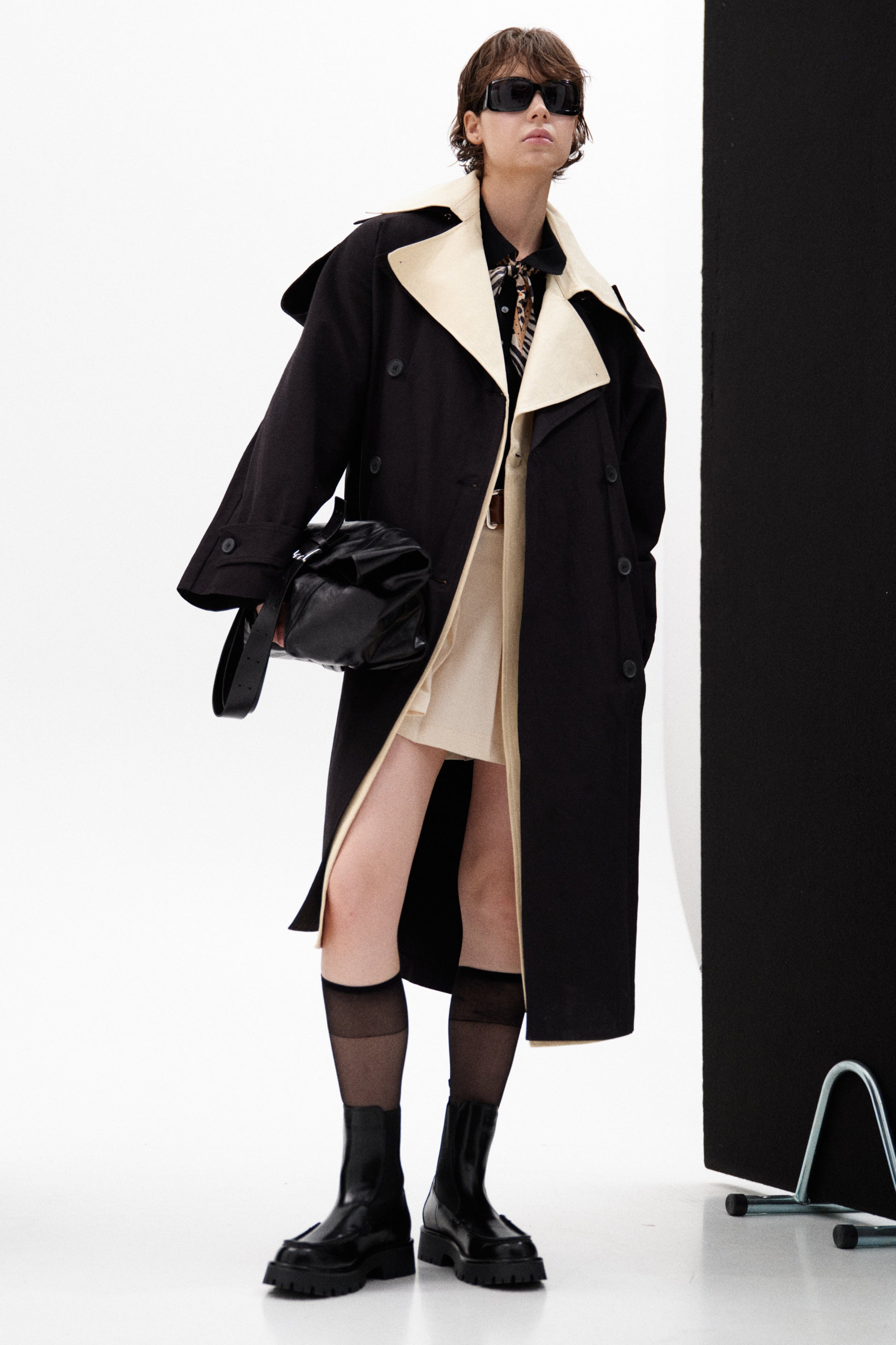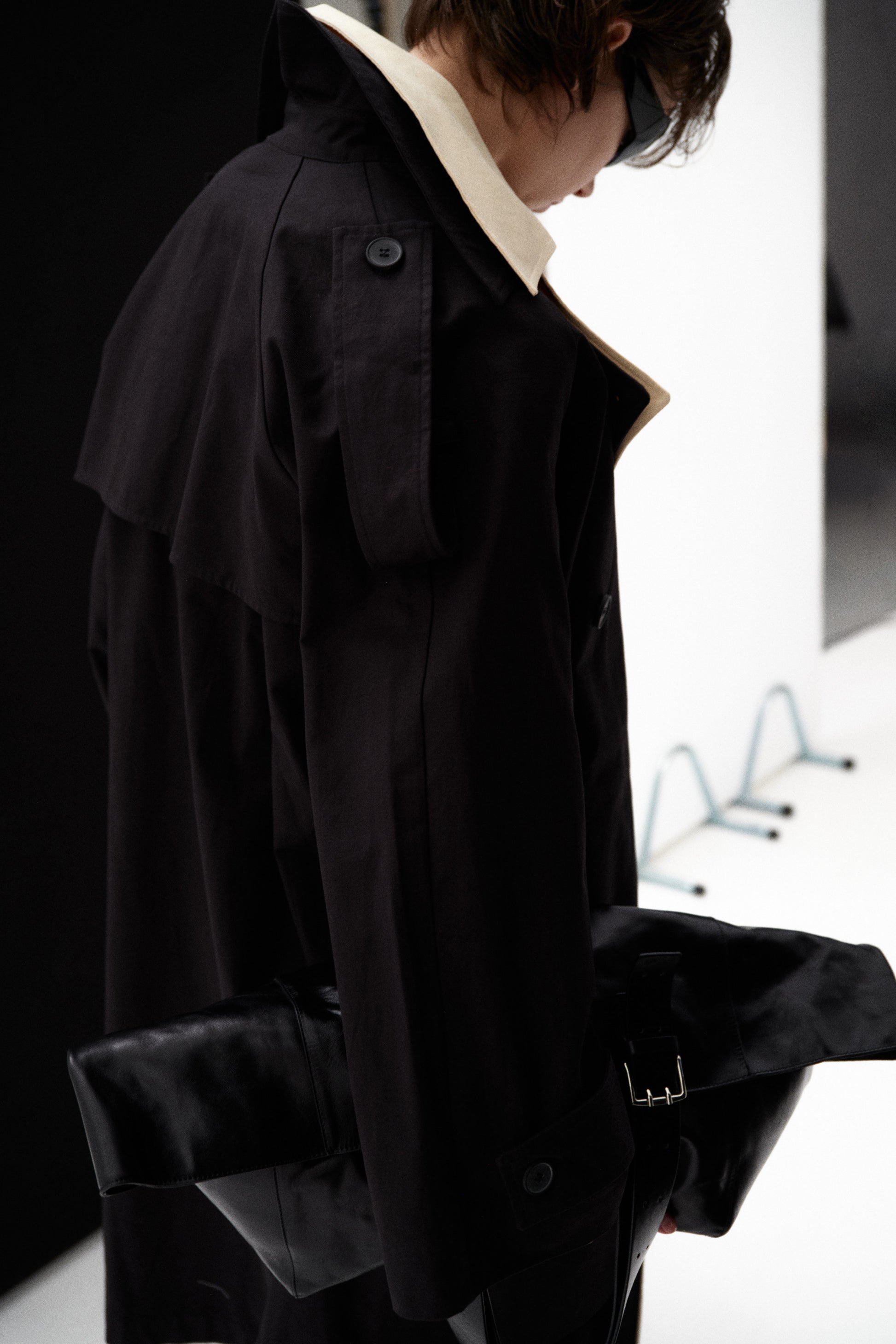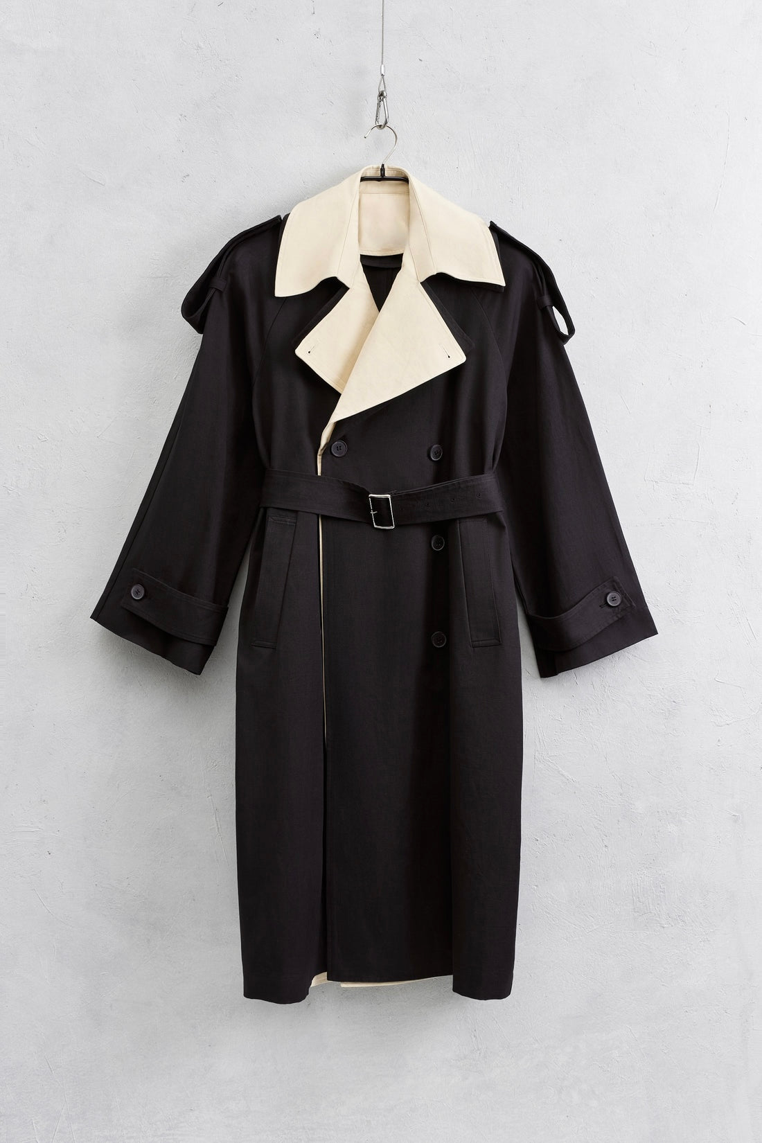 Gabardina larga con cuello de solapa. Cierre frontal cruzado con botones. Detalle de doble tejido en contraste. Tirantes en hombros y mangas. Cinturón ajustable. Bolsillos laterales delanteros. Abertura en la espalda. Corte regular, disponible en tallas S/M y M/L.