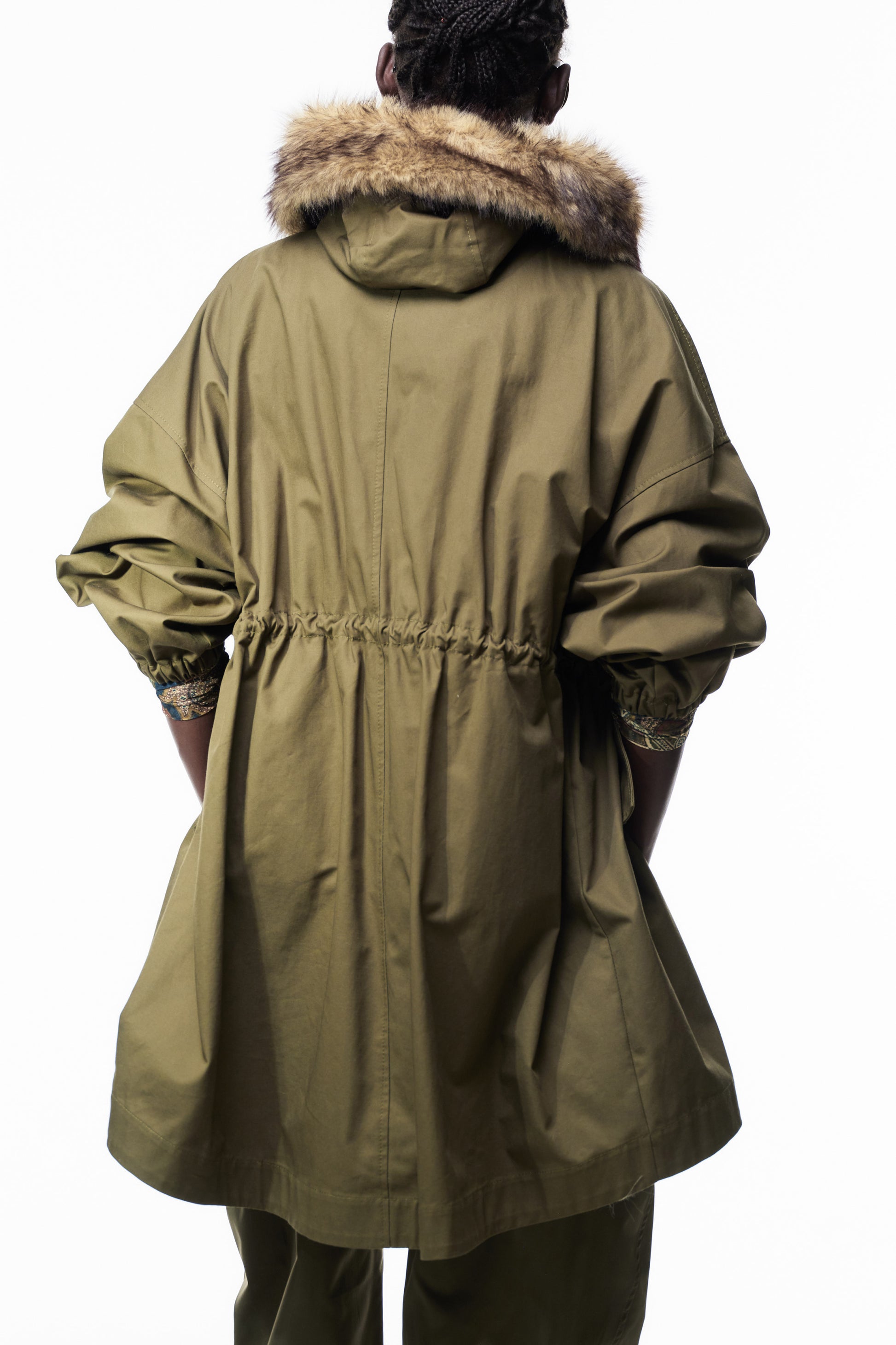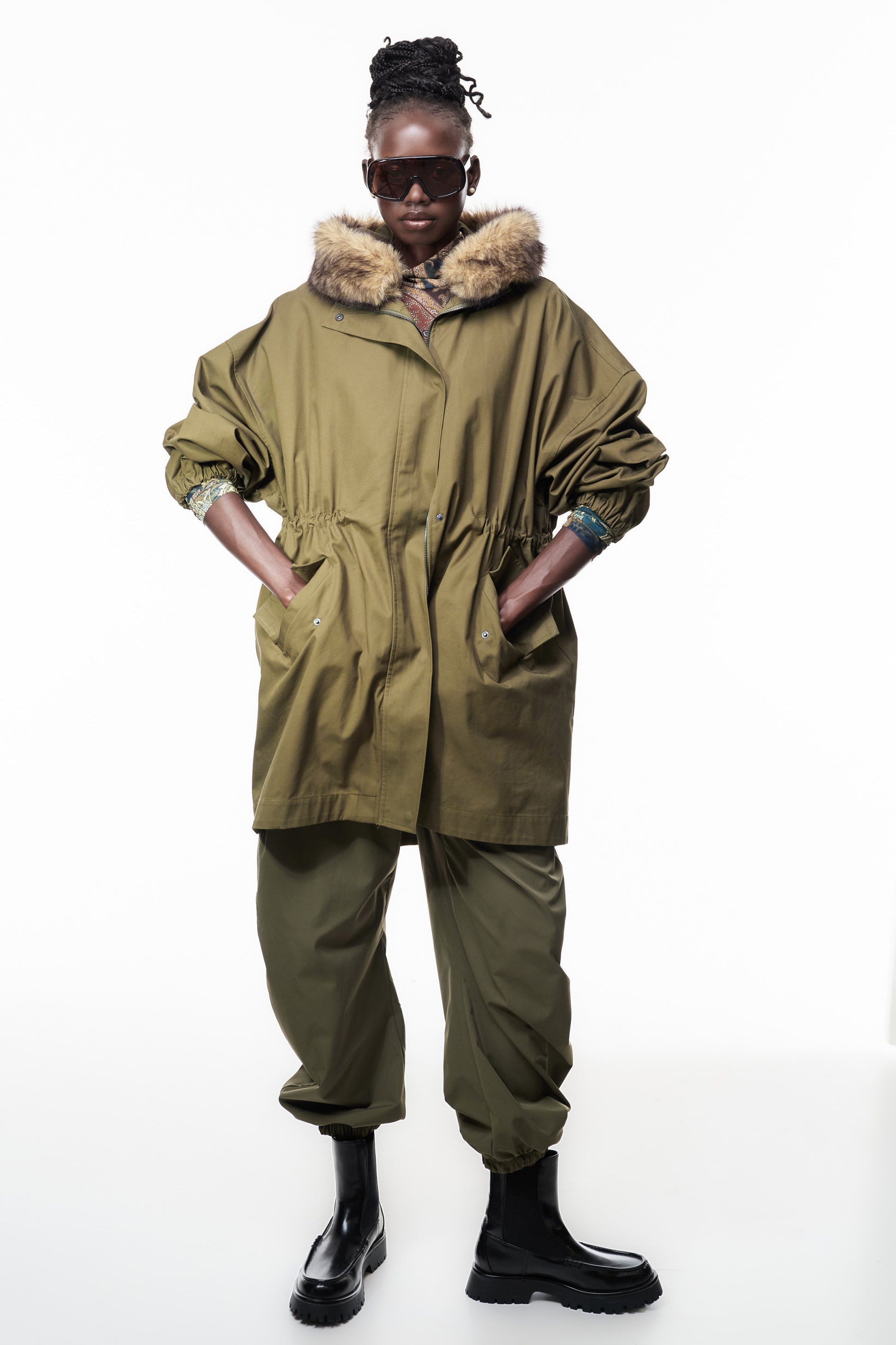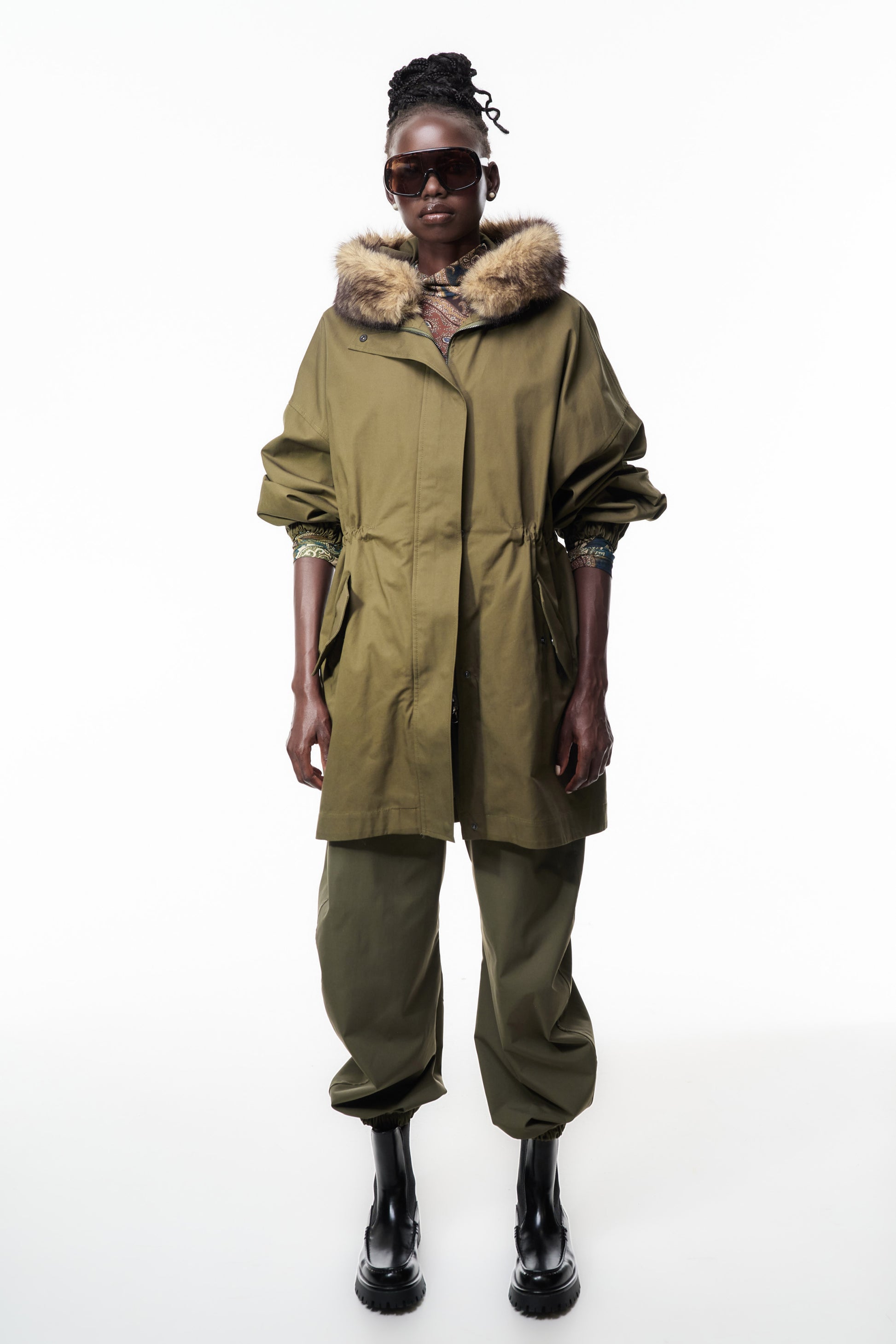 Parka confeccionada en mezcla de viscosa. Con capucha y cuello en punta. Bolsillos delanteros y en las mangas. Mangas fruncidas . Cintura con cordón ajustable. Cierre frontal con cremallera. Corte regular, disponible en tallas S/M y M/L.