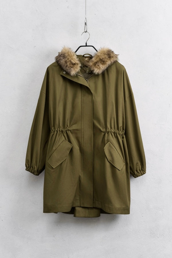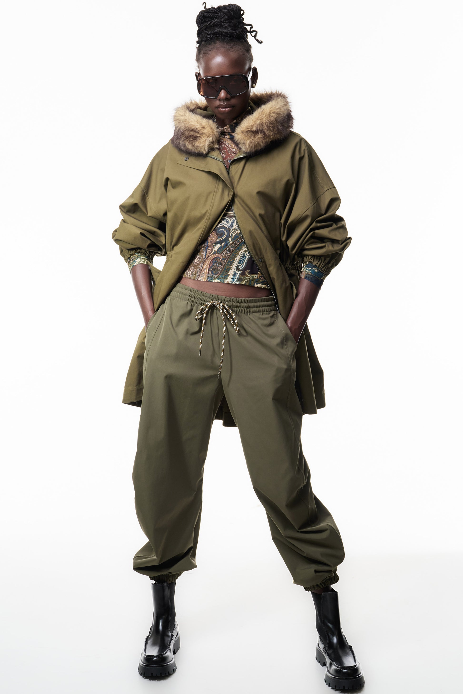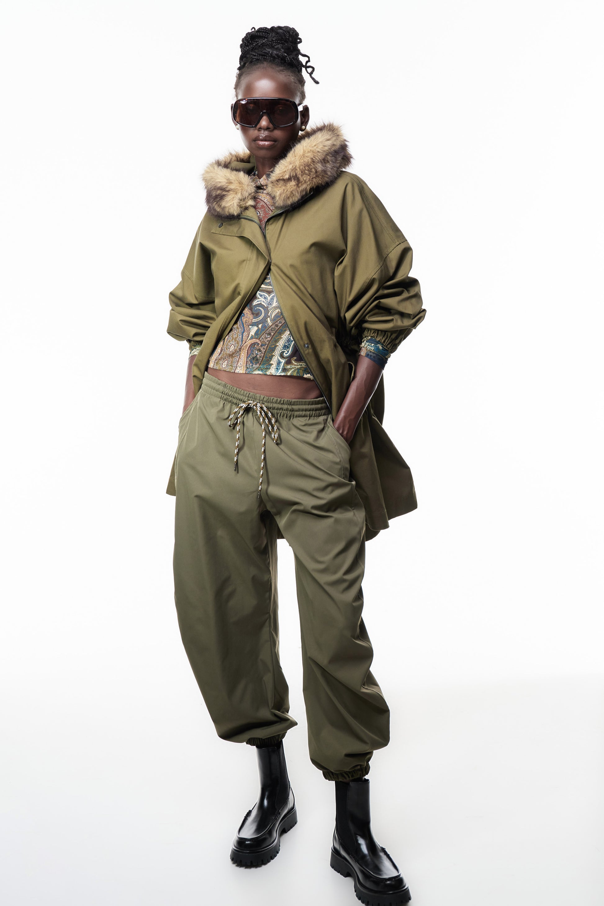 Parka confeccionada en mezcla de viscosa. Con capucha y cuello en punta. Bolsillos delanteros y en las mangas. Mangas fruncidas . Cintura con cordón ajustable. Cierre frontal con cremallera. Corte regular, disponible en tallas S/M y M/L.