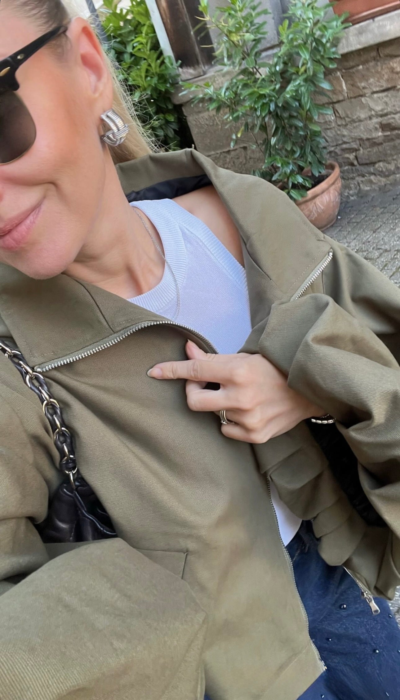 Chaqueta bomber con cuello en punta. Bolsillos delanteros. Bajos fruncidos. Cierre frontal con cremallera. Corte regular, disponible en talla S/M, M/L .