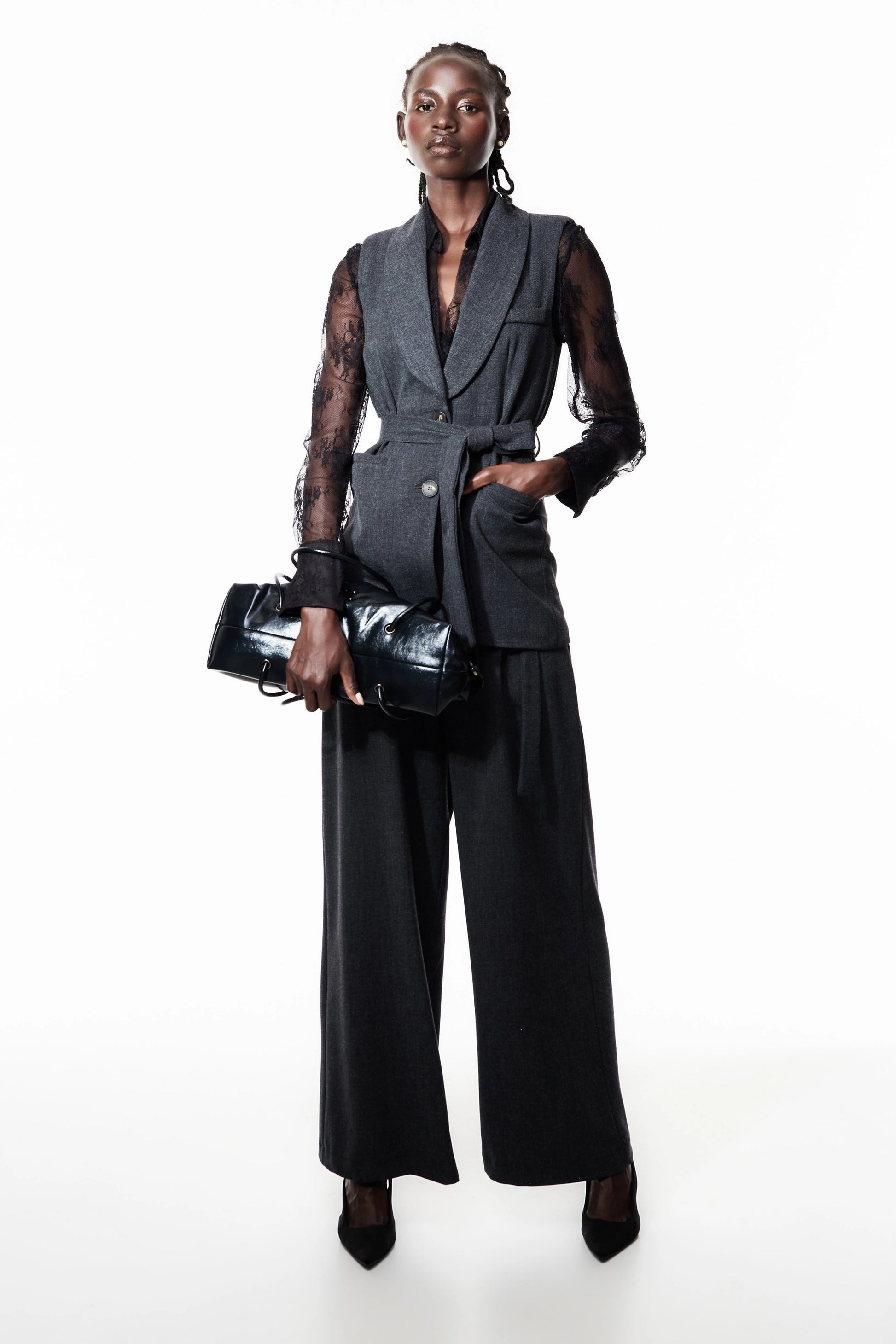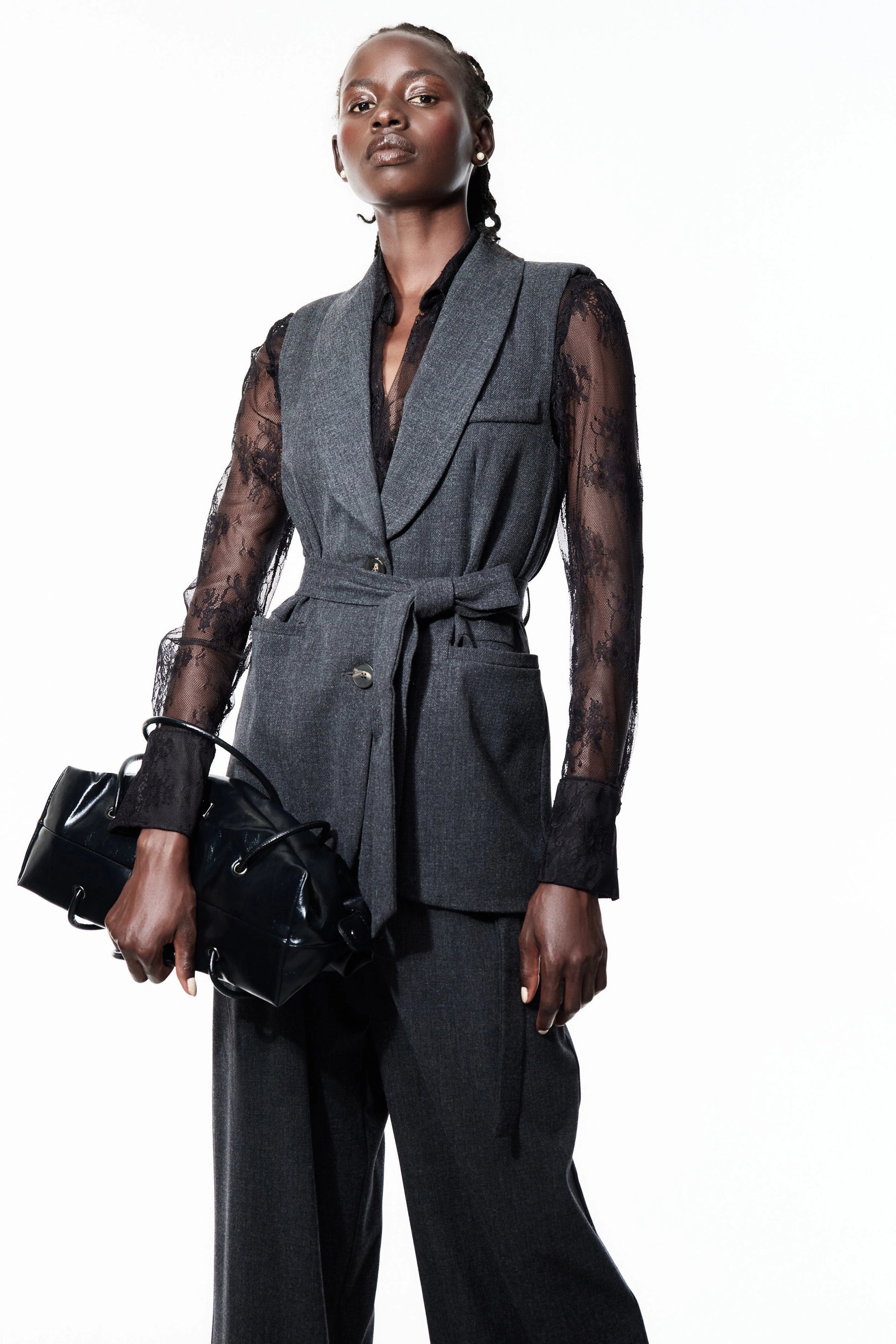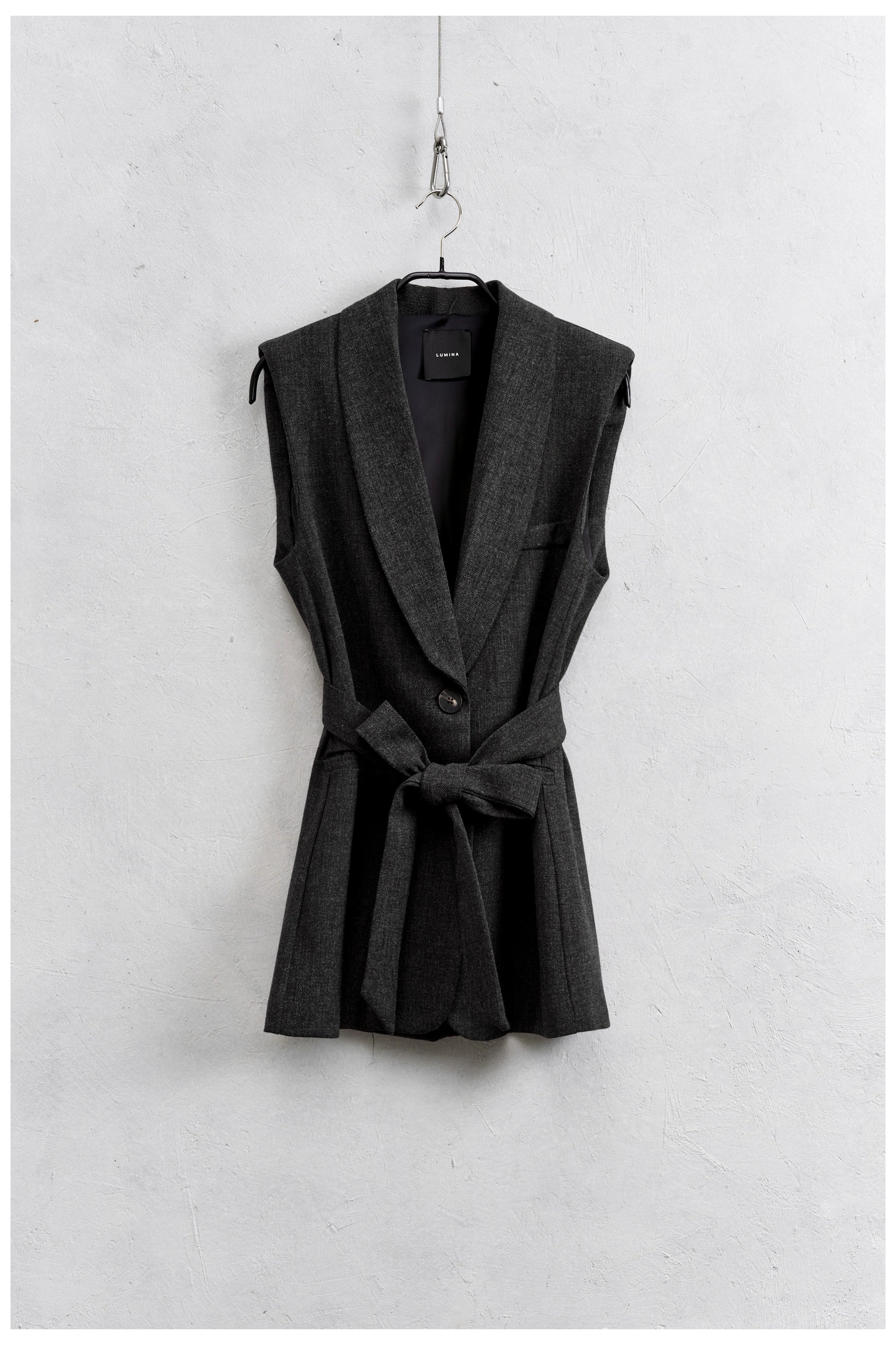 Chaleco de escote pico con solapa y manga sisa. Cierre frontal con botones, cinturón en mismo tono.