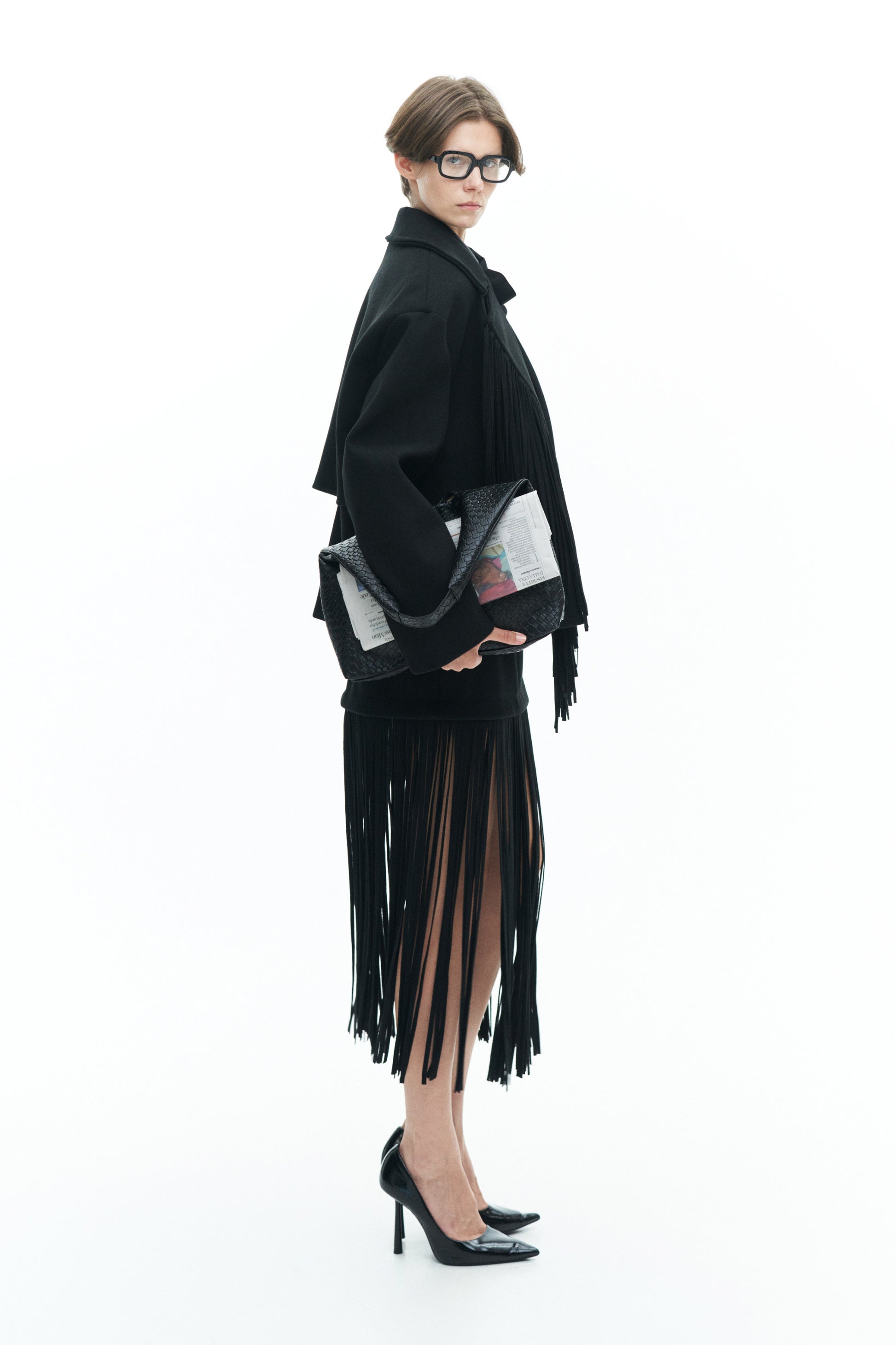 Chaqueta de manga larga con cuello de solapa y forro interior. Detalle de flecos en los bolsillos delanteros y laterales. Corte ligeramente oversize, disponible en talla única.