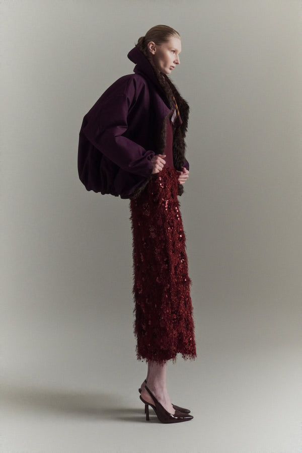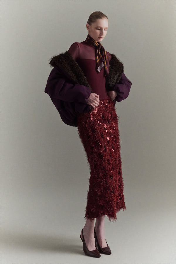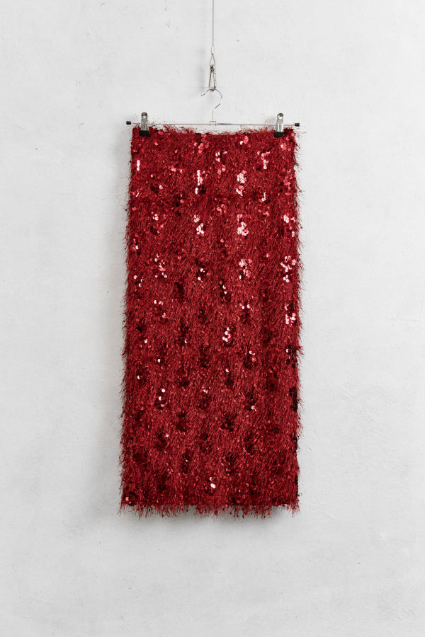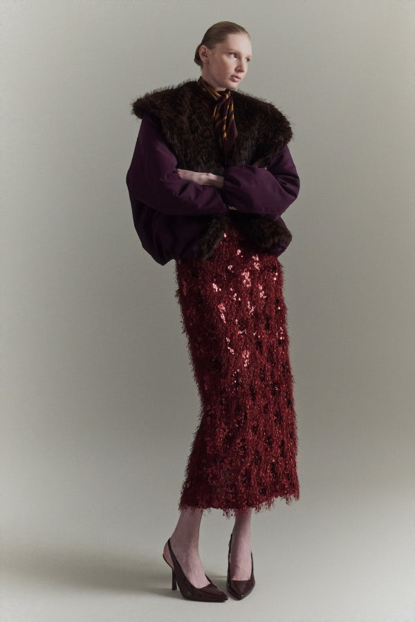 Falda midi de tiro medio. Detalle de aplicación de lentejuelas y pelo. Cierre lateral con cremallera oculta en costura.