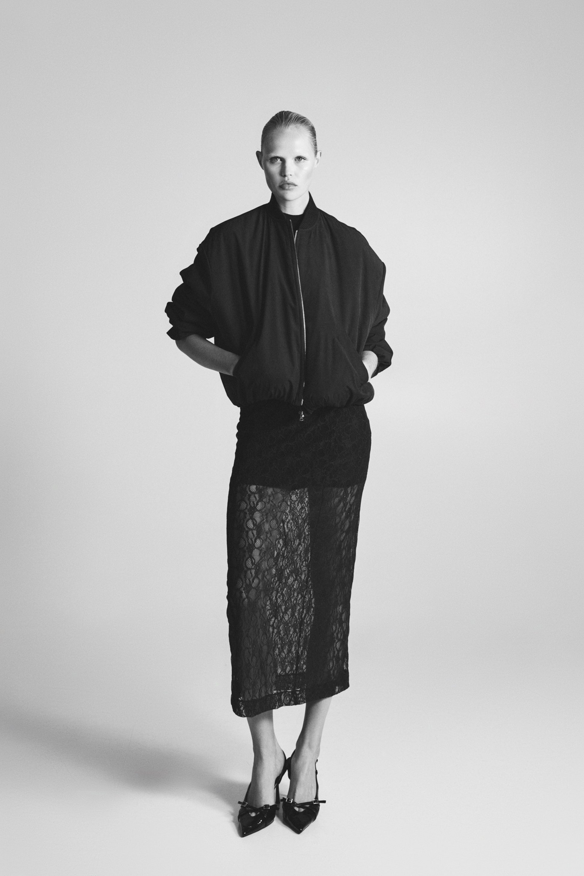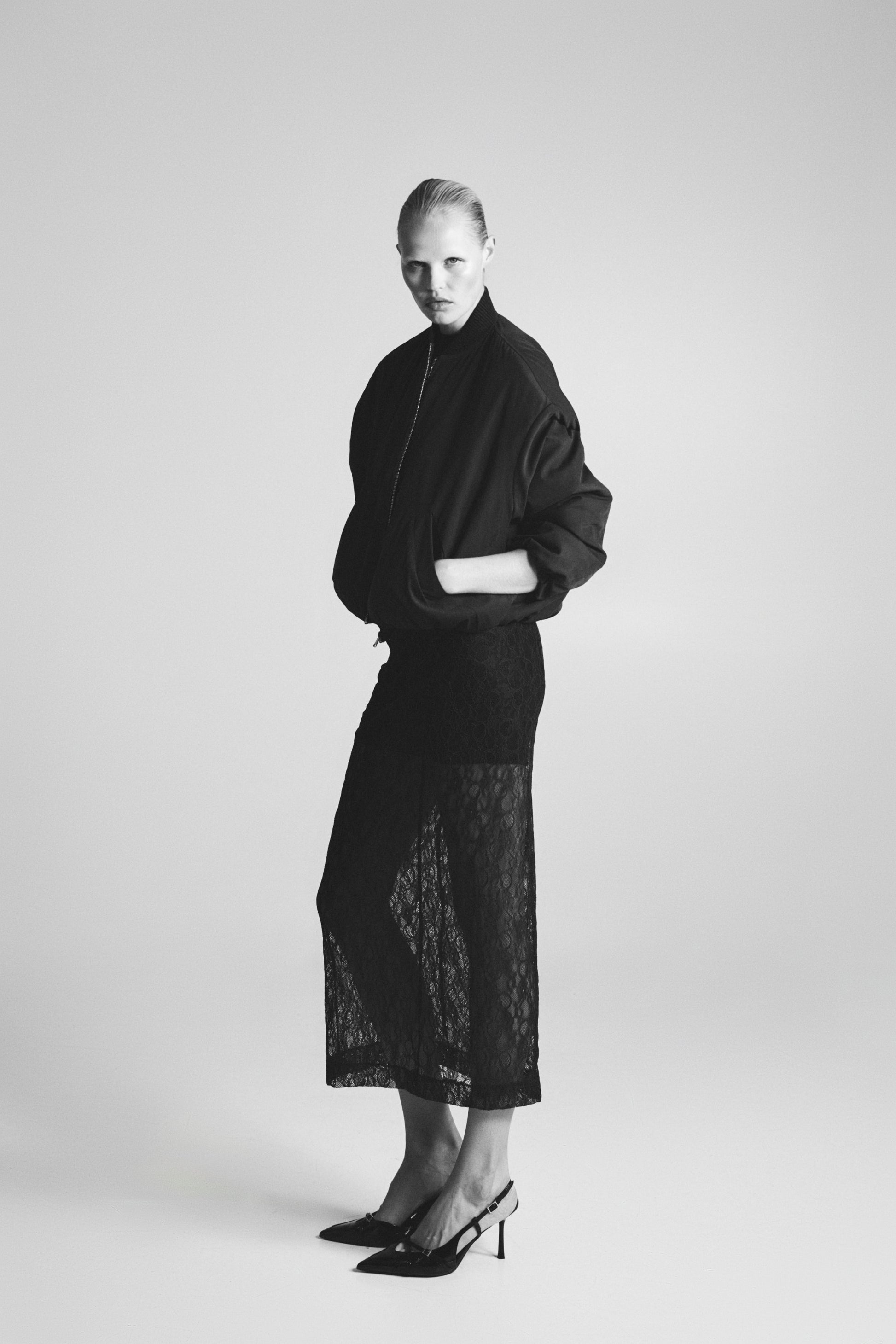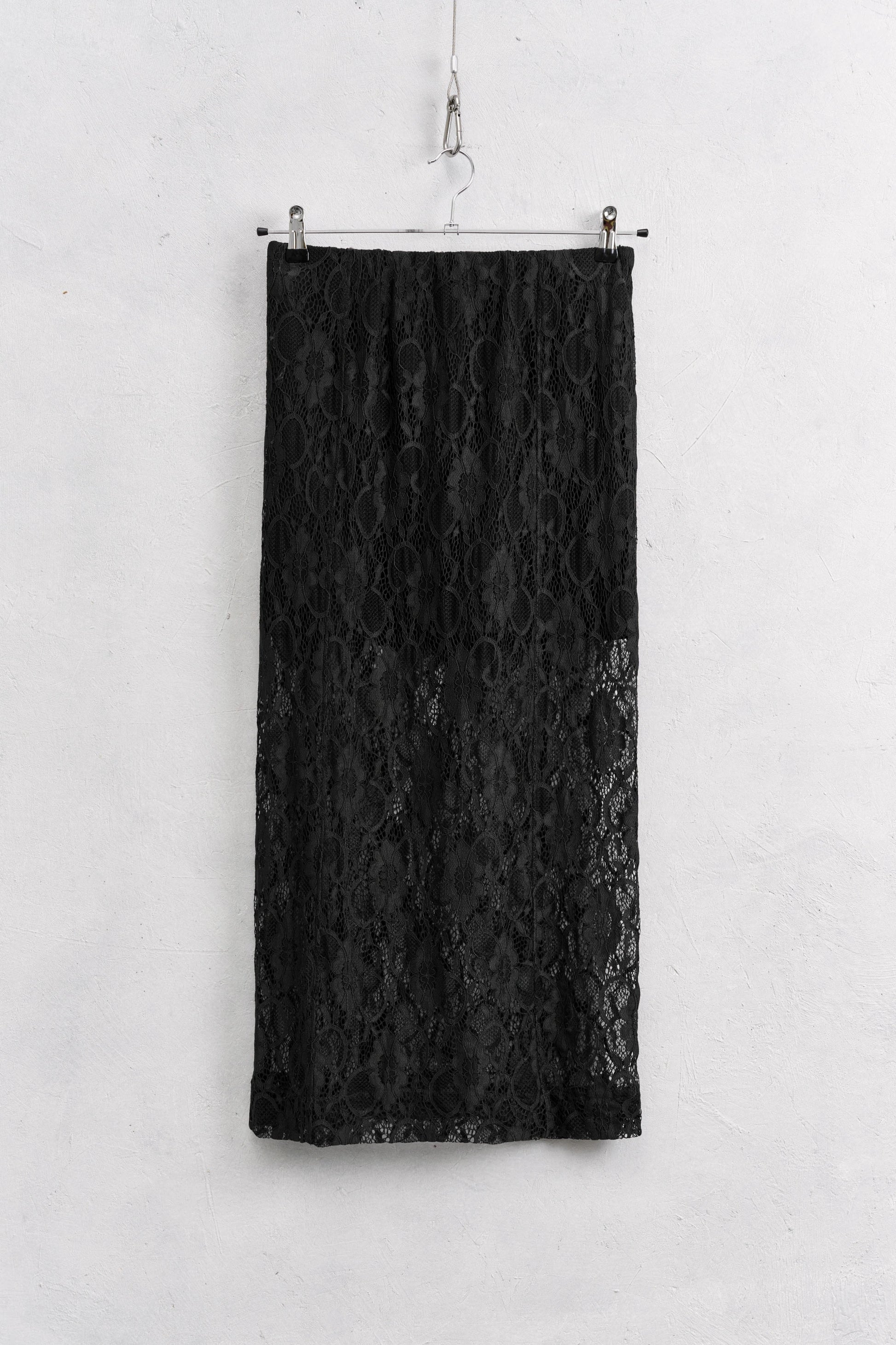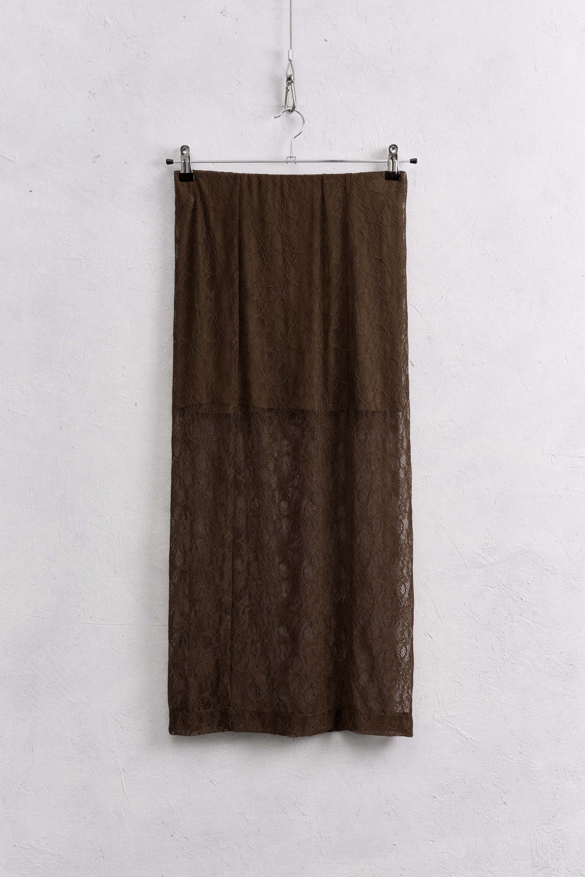 Falda de tiro alto. Tejido combinado en encaje. Bajo con abertura en espalda. Cierre lateral con cremallera oculta en costura.