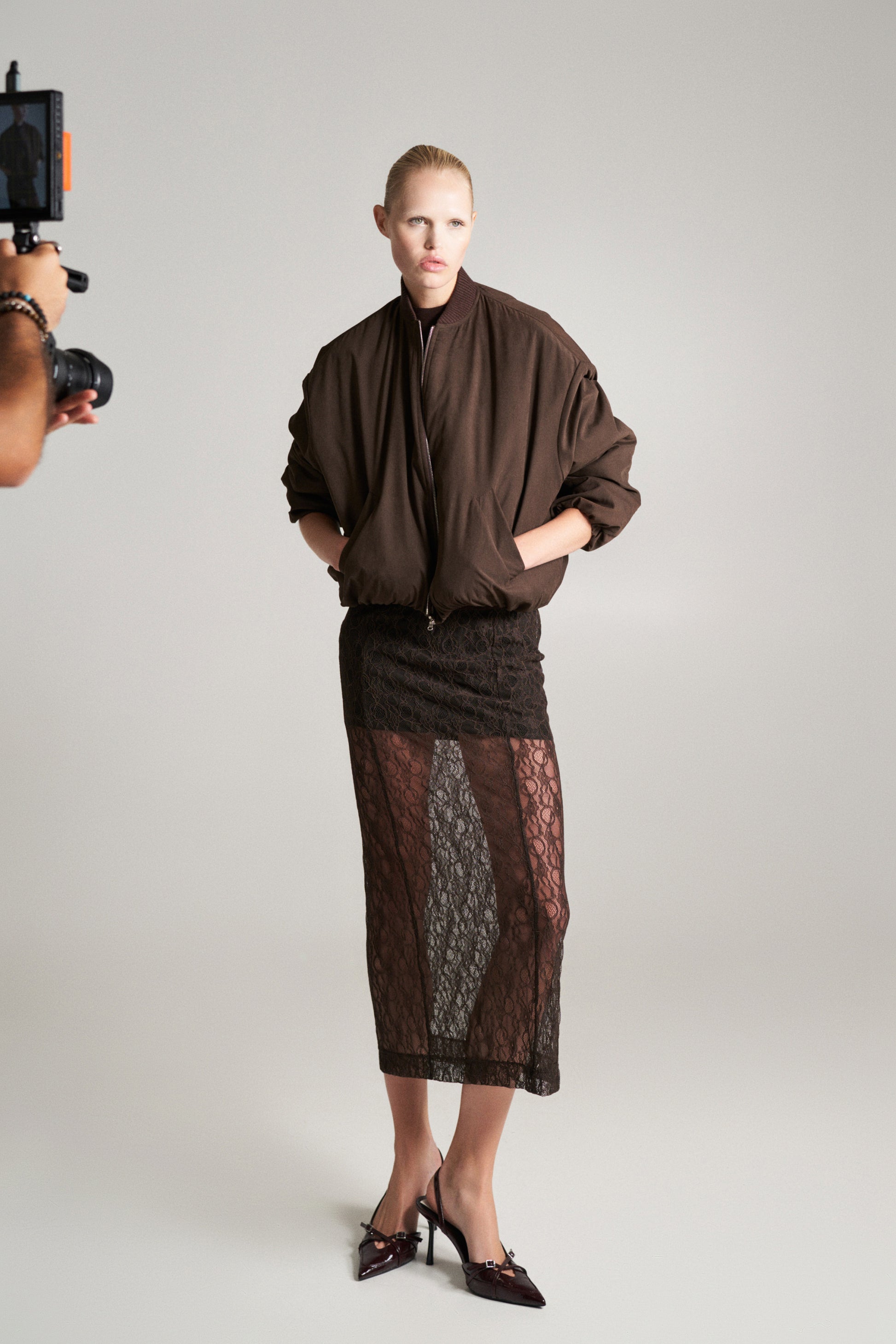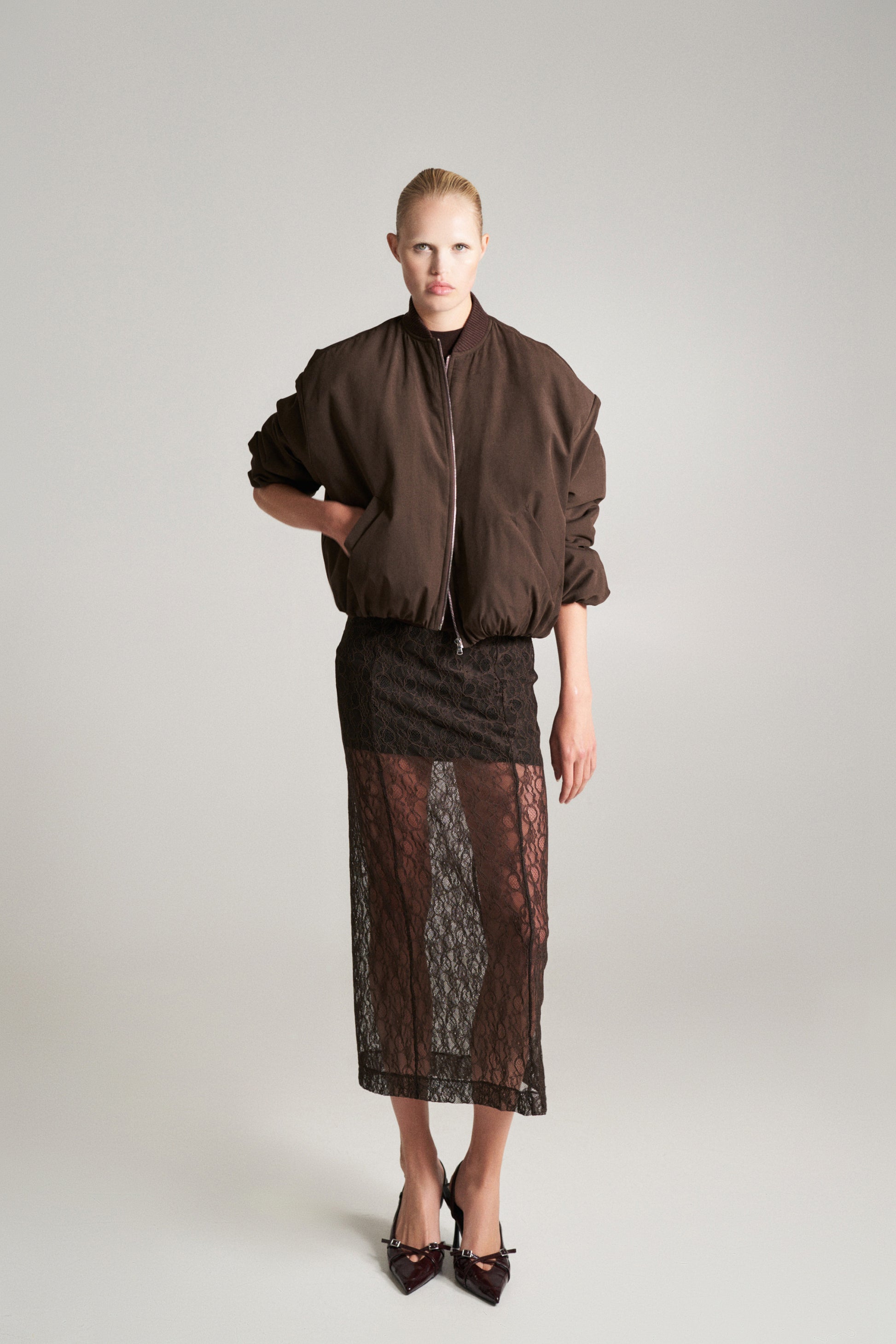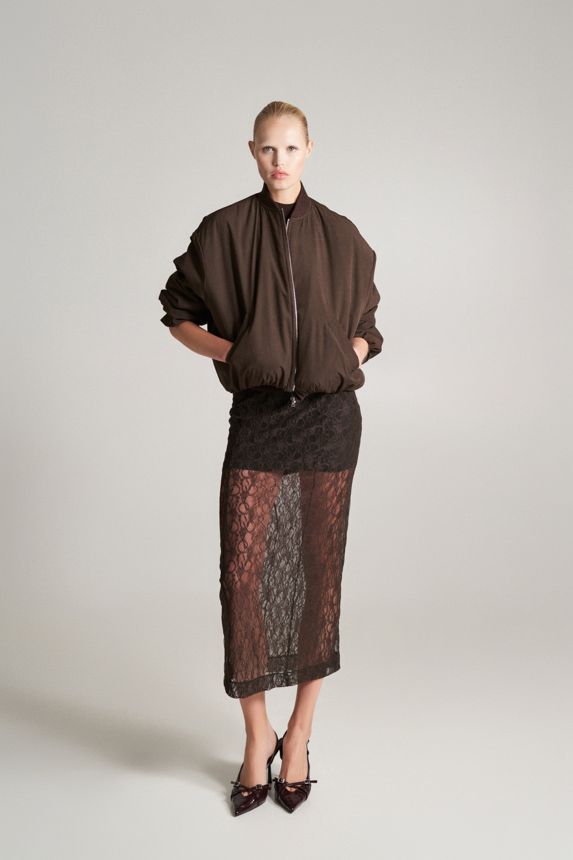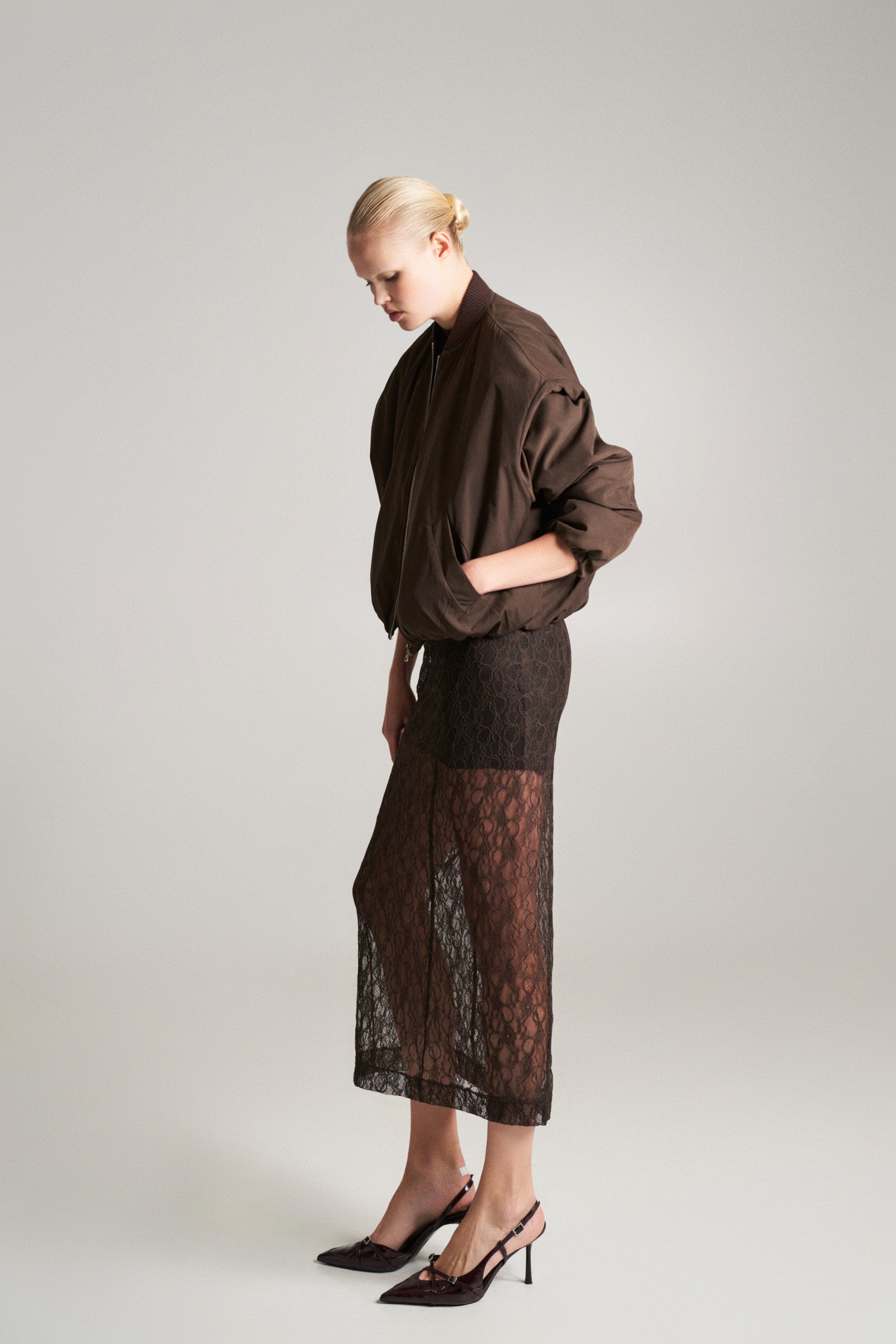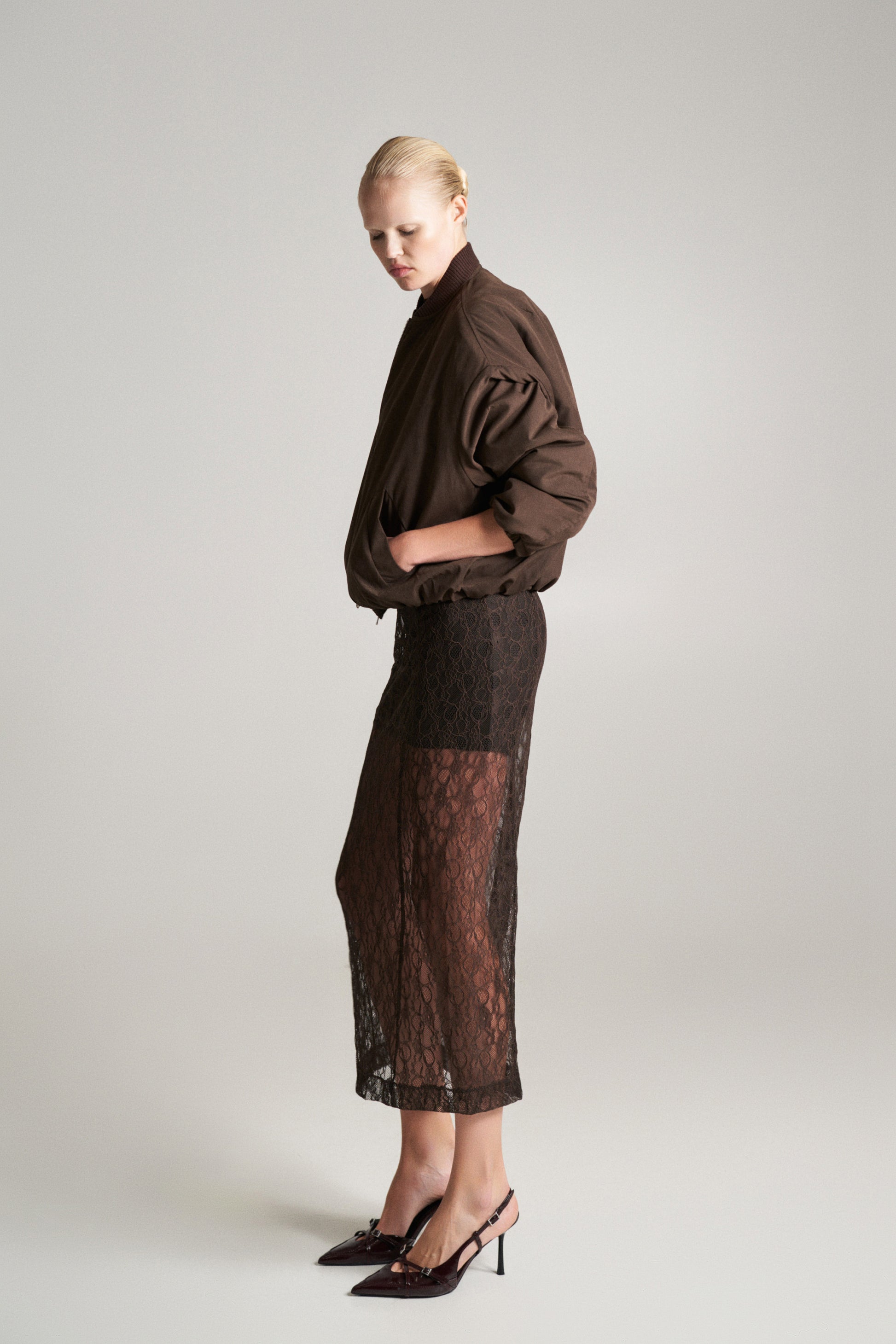 Falda de tiro alto. Tejido combinado en encaje. Bajo con abertura en espalda. Cierre lateral con cremallera oculta en costura.