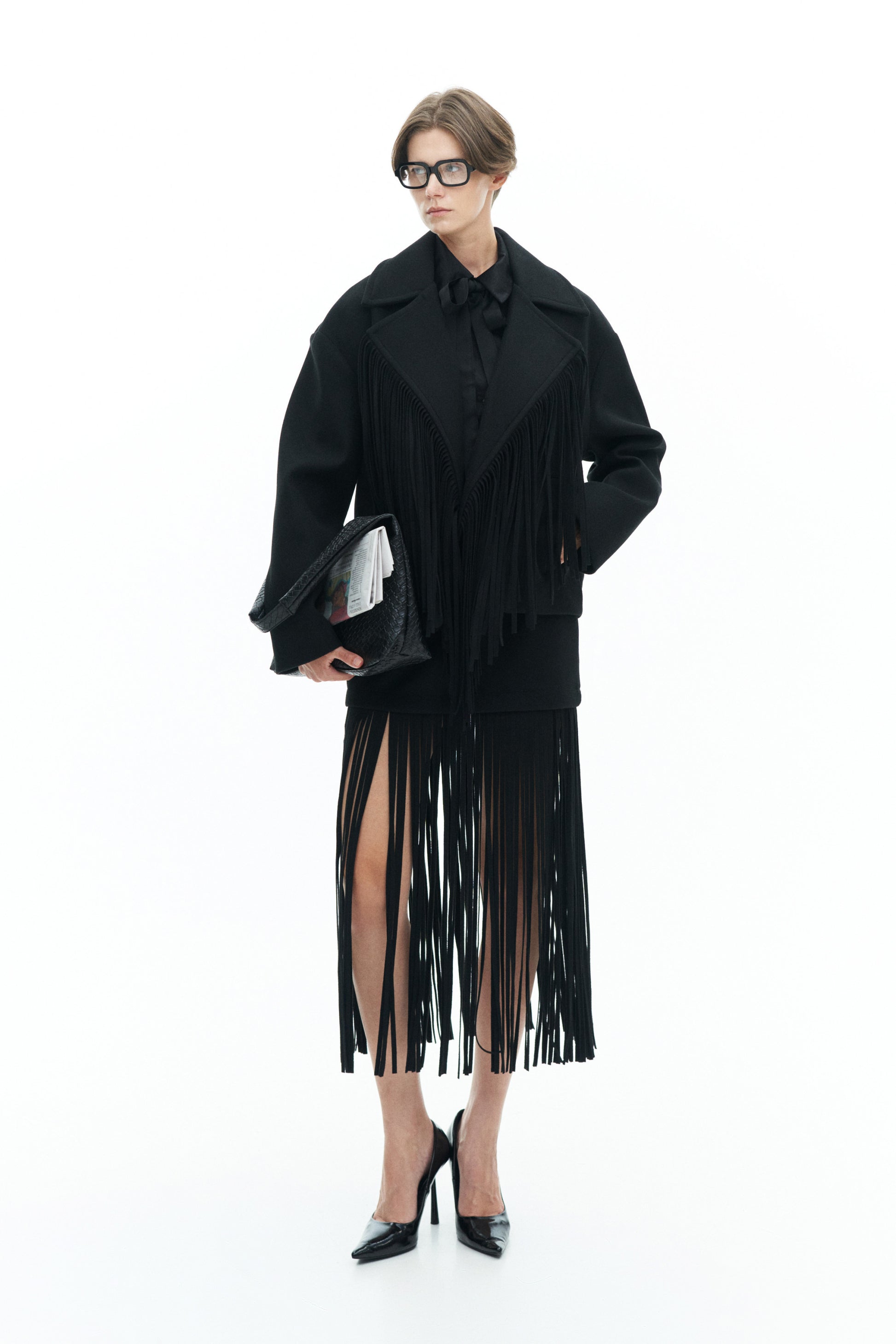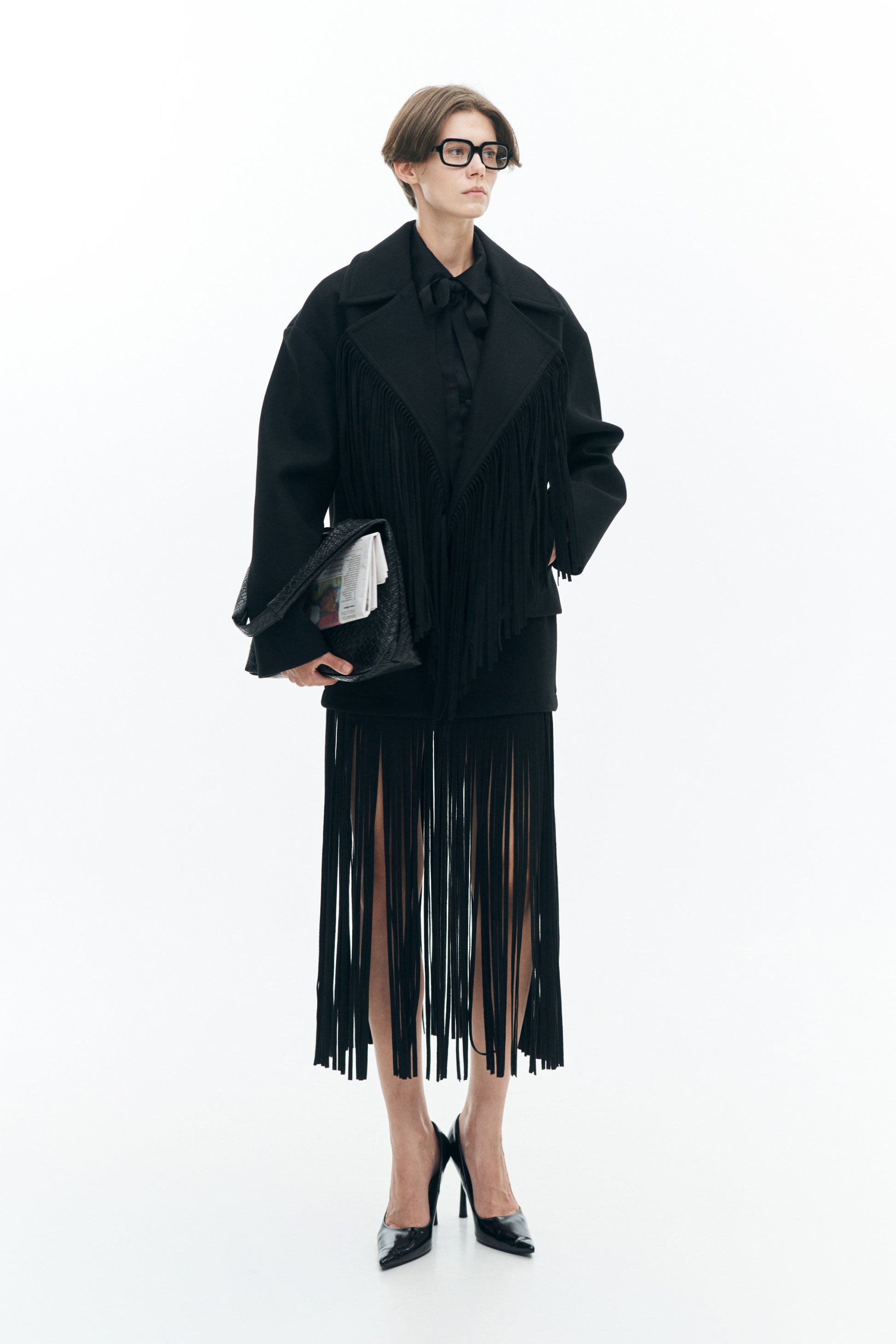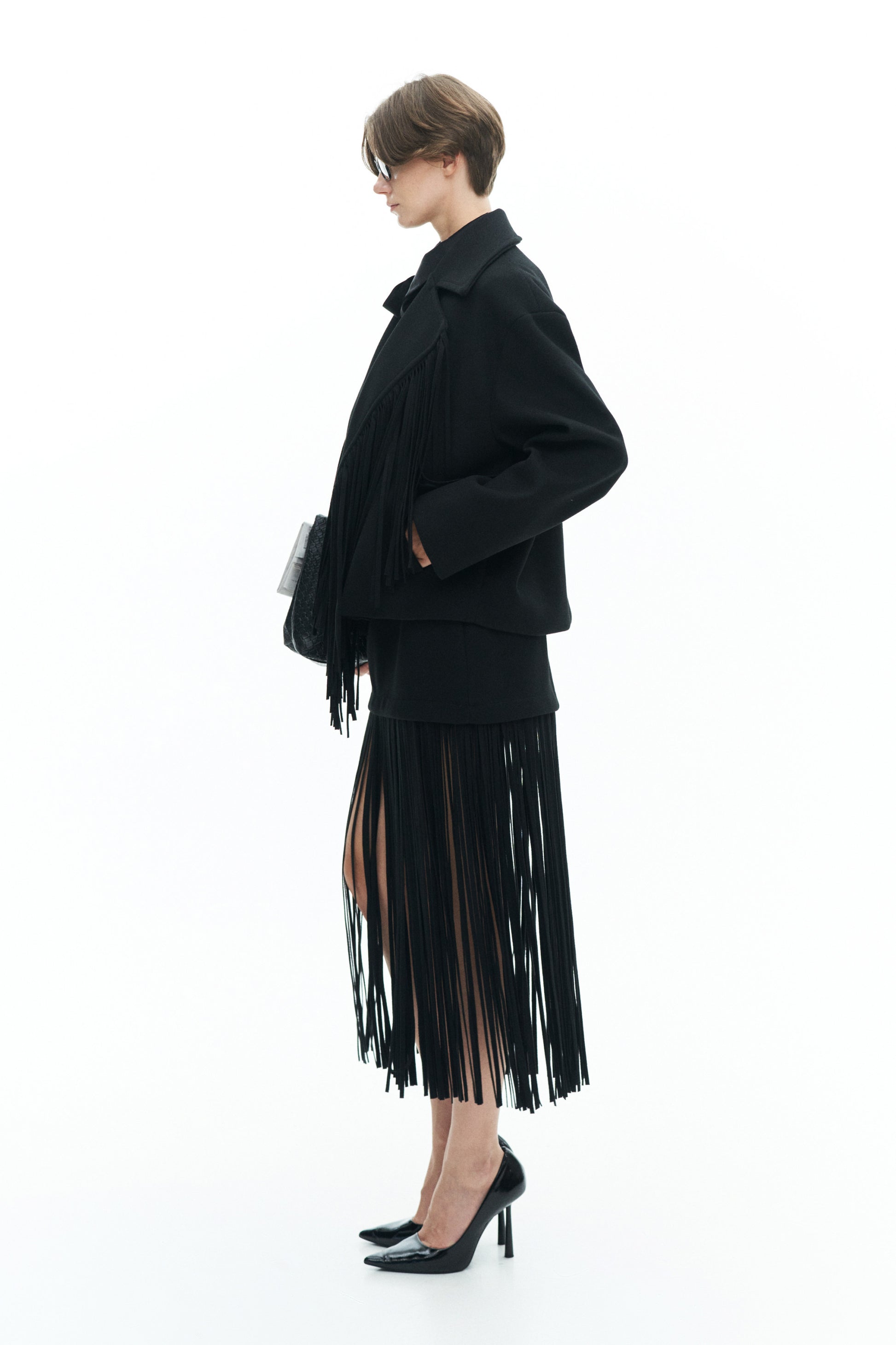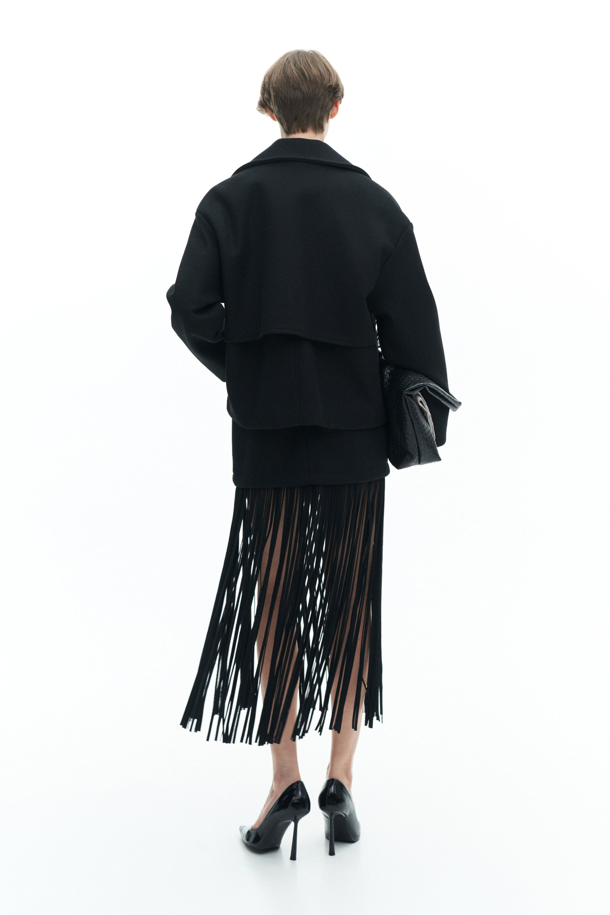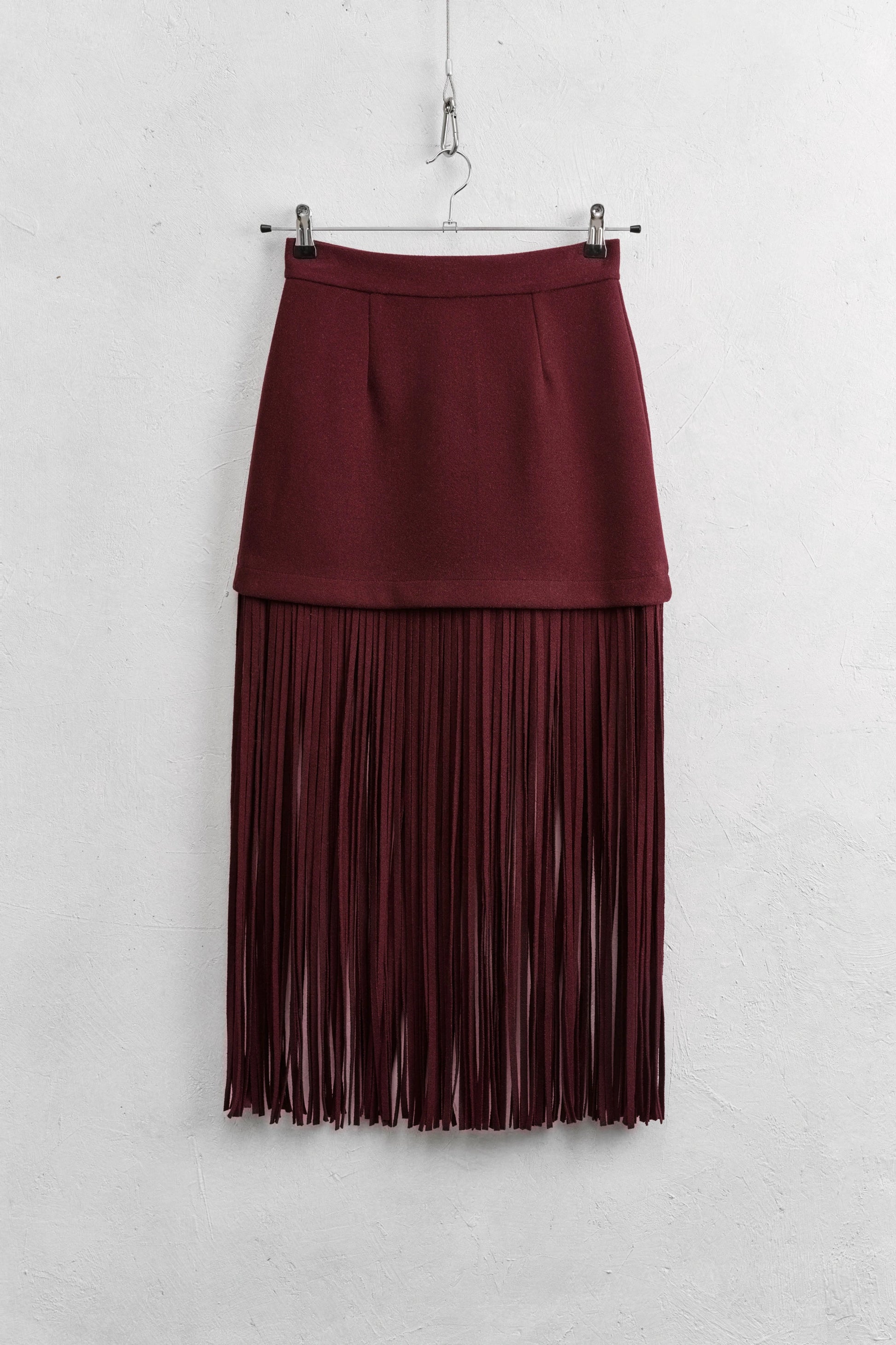 Falda de cintura alta con pliegues delanteros y cierre de cremallera. Detalle de flecos tono sobre tono en el bajo. Corte regular, disponible en tallas S, M y L.