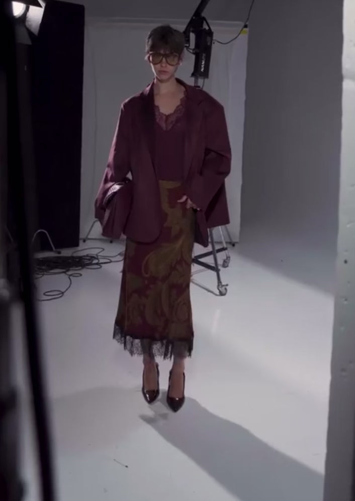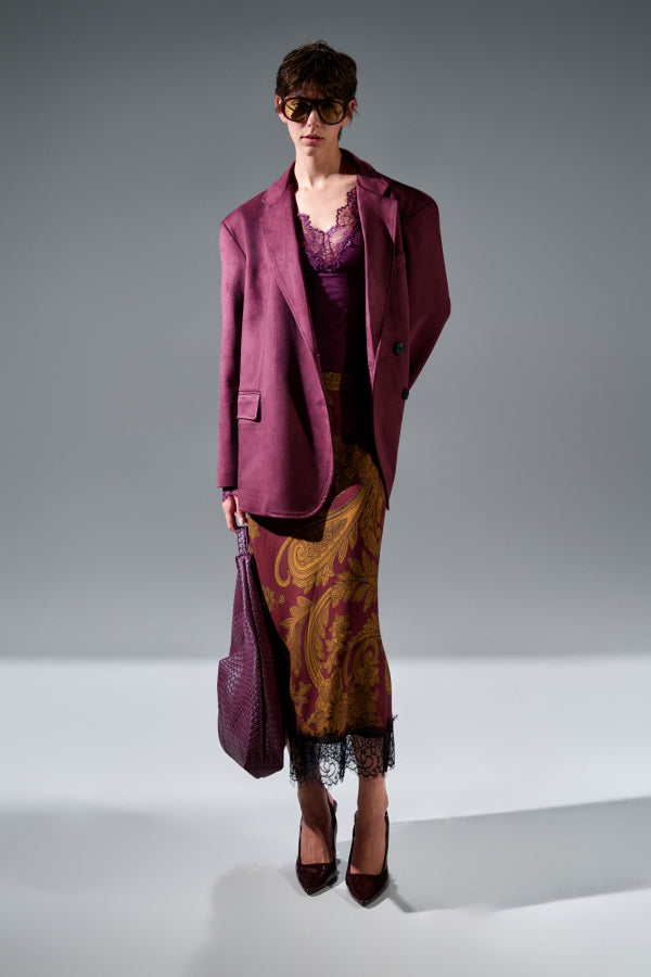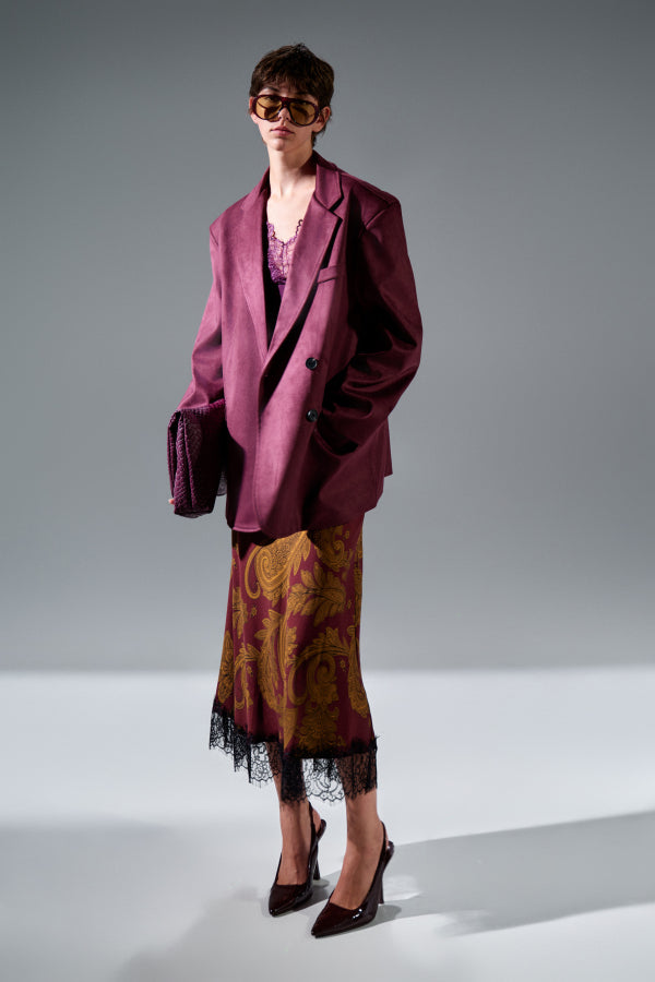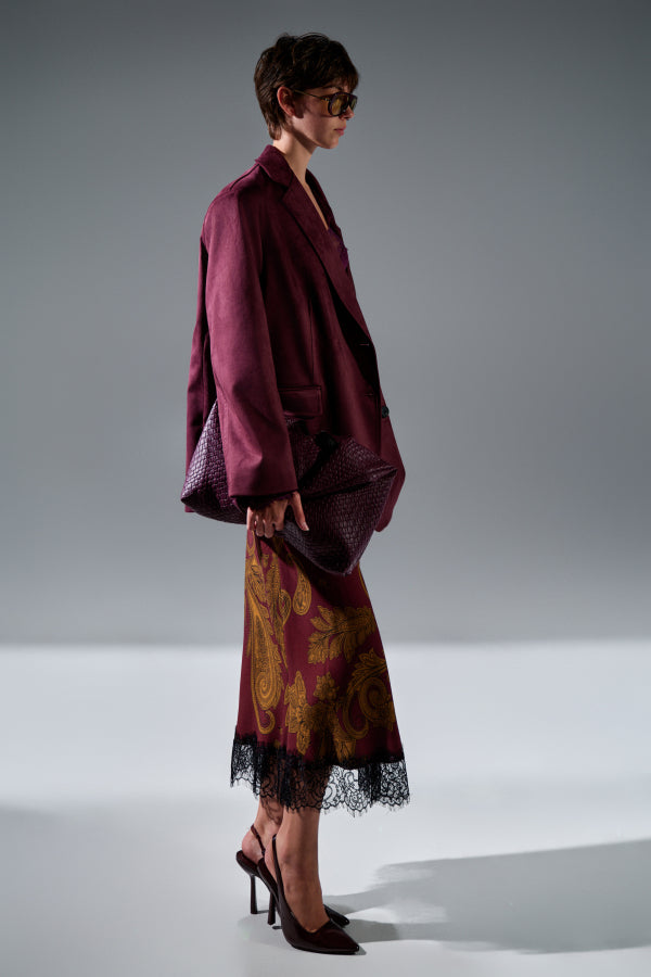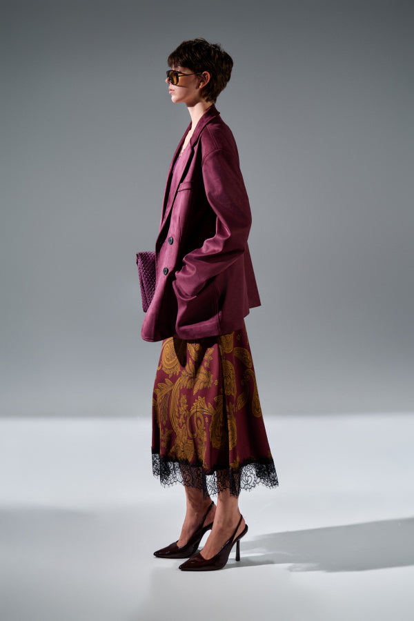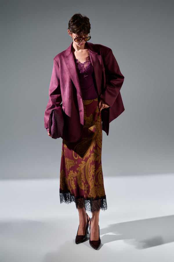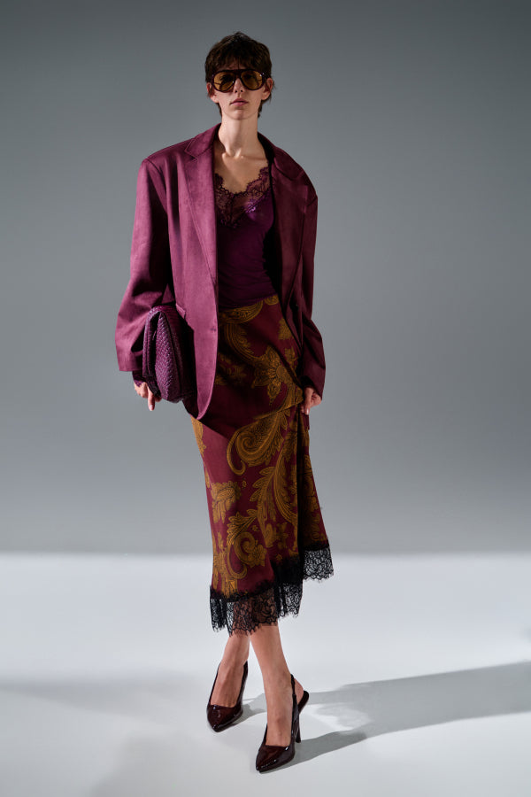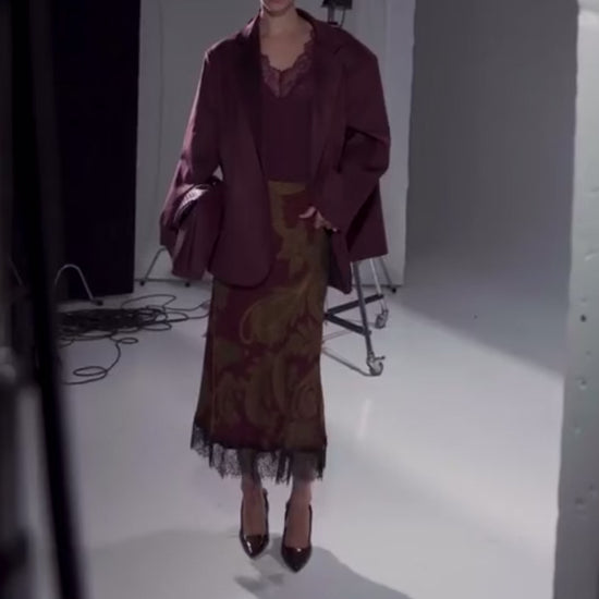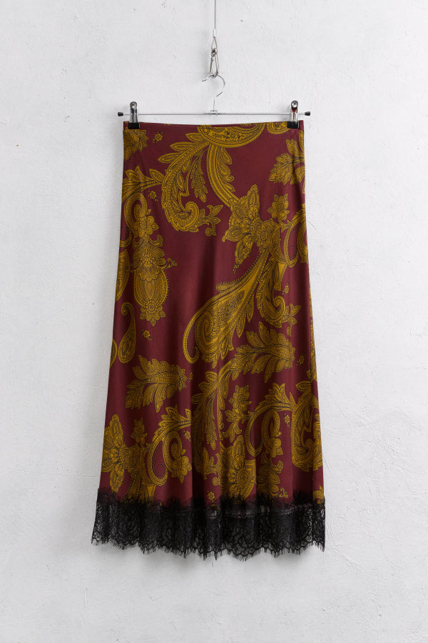 Falda larga de satén con encaje. Con estampado. Corte regular, disponible en tallas S/M y M/L.