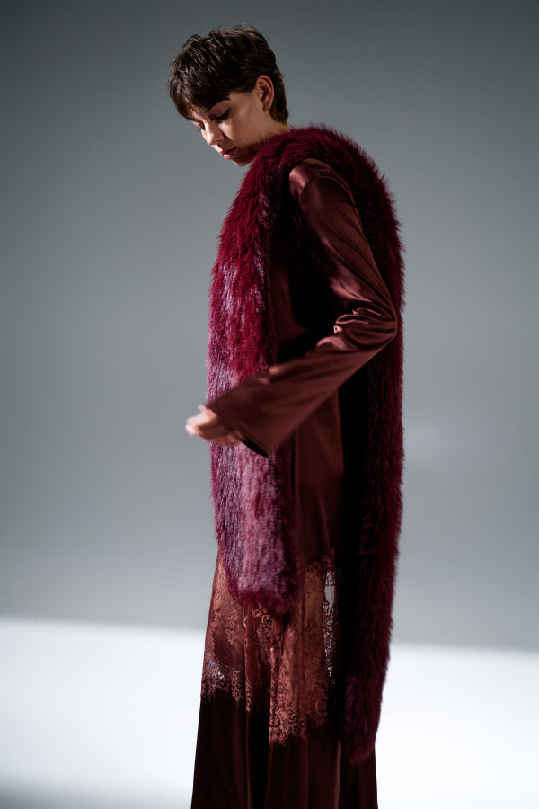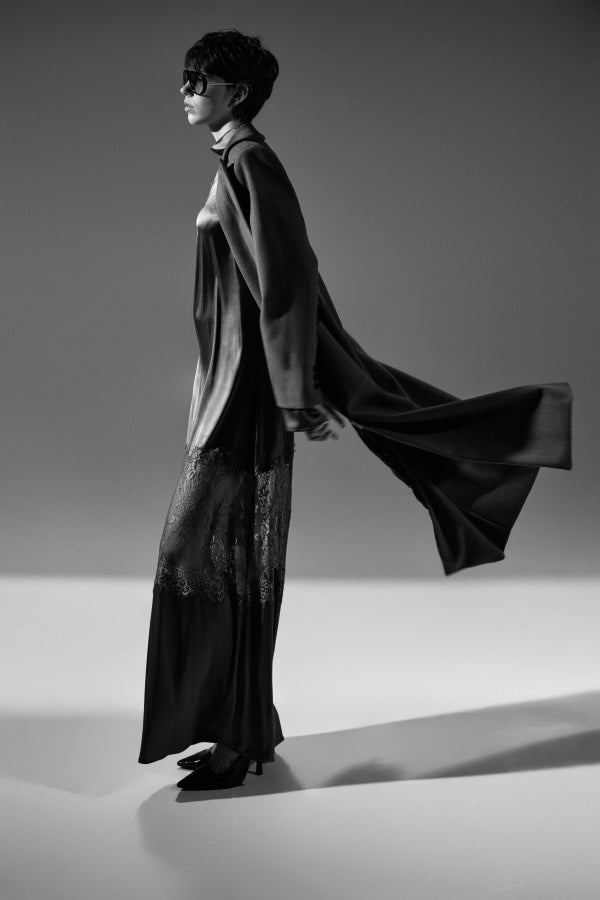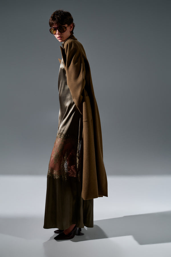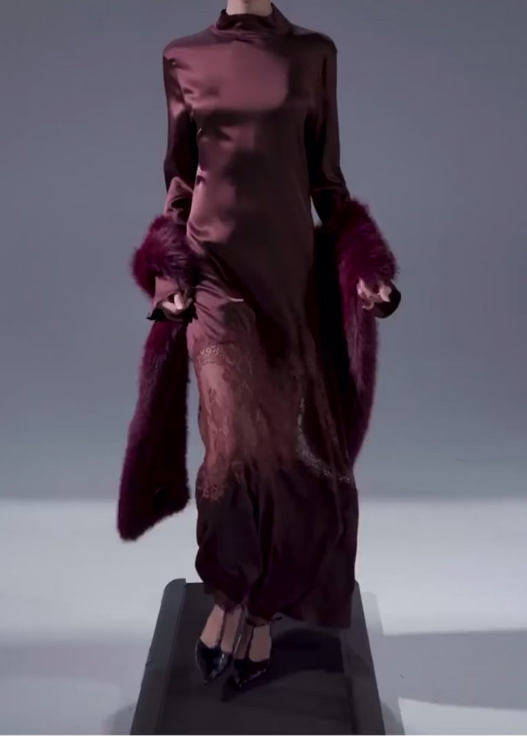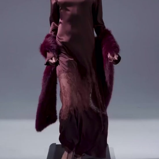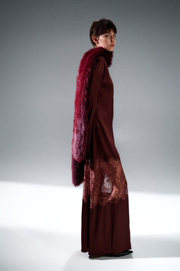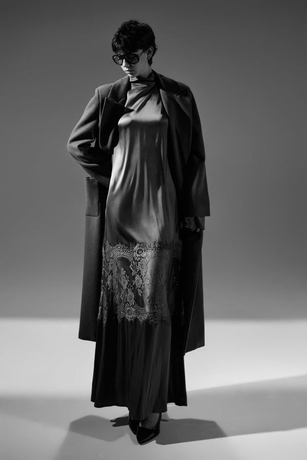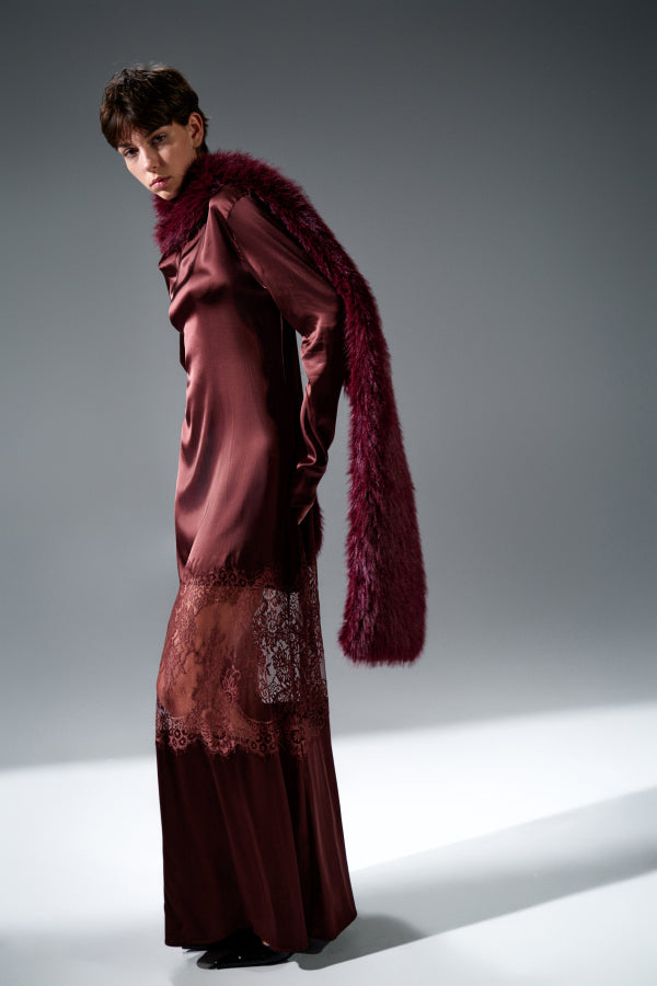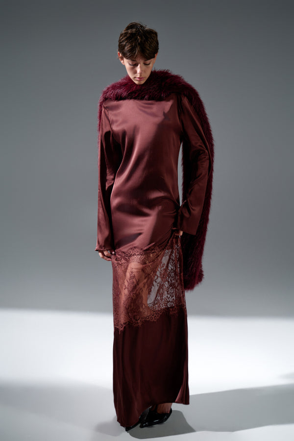 Vestido de satén con escote redondo. Confeccionado en mezcla de viscosa. Presenta manga larga. Detalle de aplique de encaje. Corte regular, disponible en tallas S/M y M/L.
